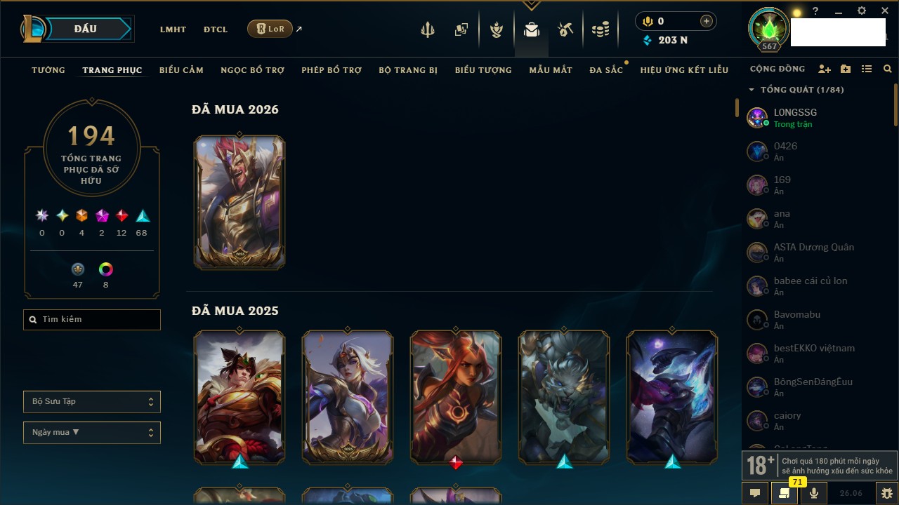 Rank Đơn: Chưa RankKhung: Bạch kimTướng: 168 - Còn 83003 THXTrang Phục: 210Rank ĐTCL: Chưa RankLinh Thú: 36