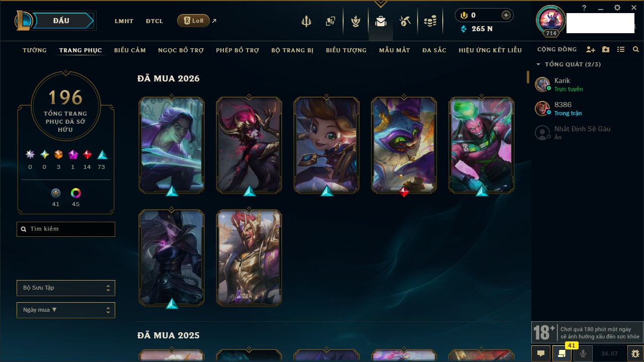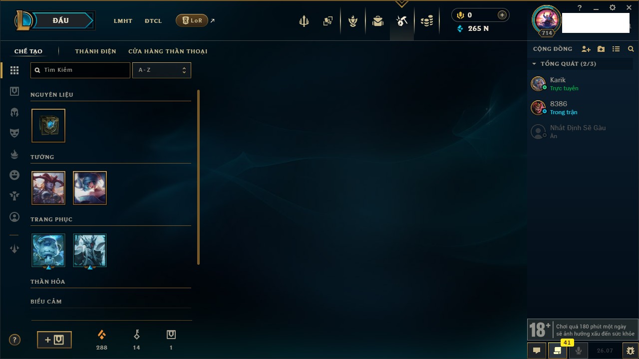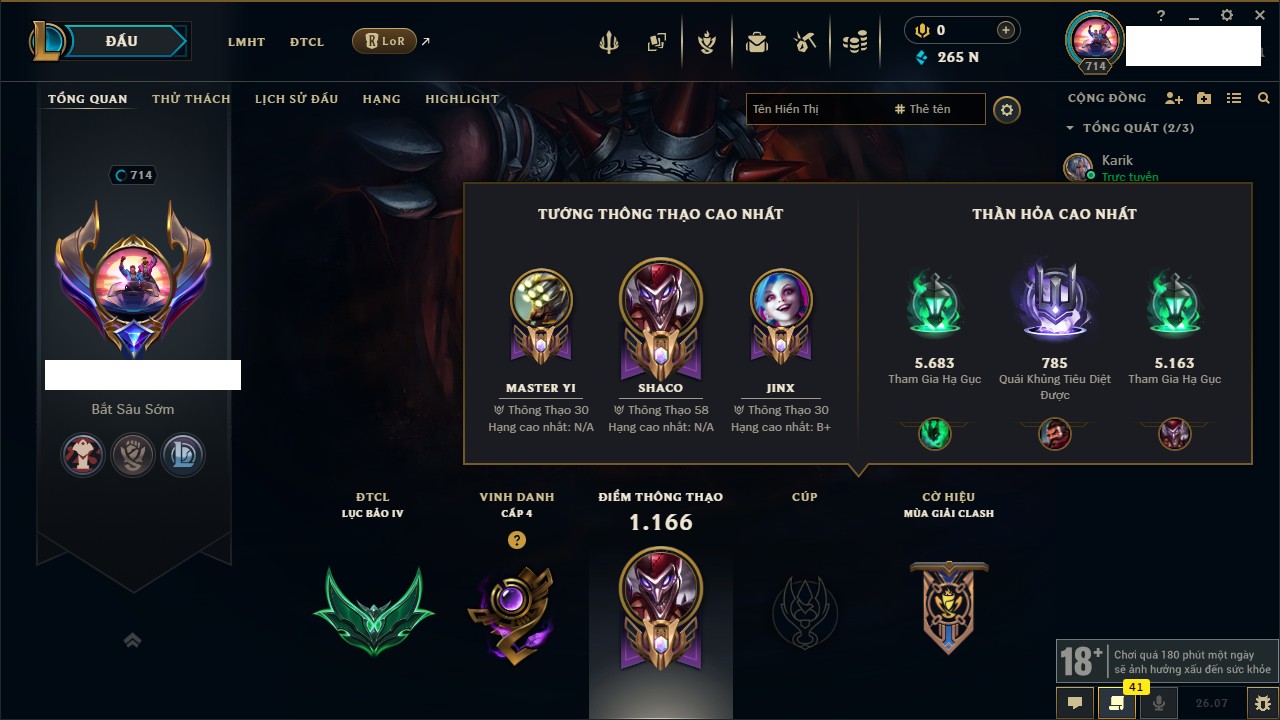 Rank Đơn: Chưa RankKhung: Chưa có khungTướng: 105 - Còn 590 THXTrang Phục: 124Rank ĐTCL: Chưa RankLinh Thú: 61