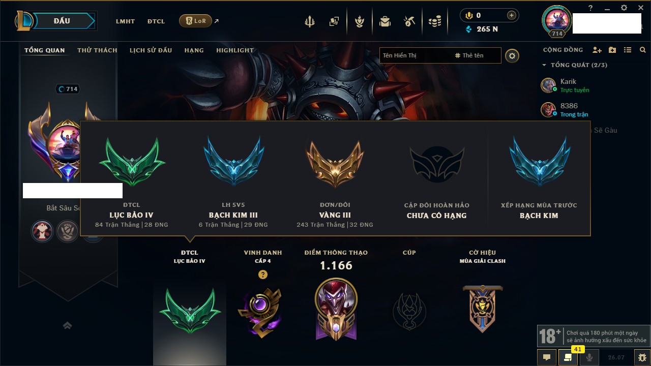 Rank Đơn: Vàng IIIKhung: Chưa có khungTướng: 172 - Còn 242034 THXTrang Phục: 195Rank ĐTCL: Chưa RankLinh Thú: 60