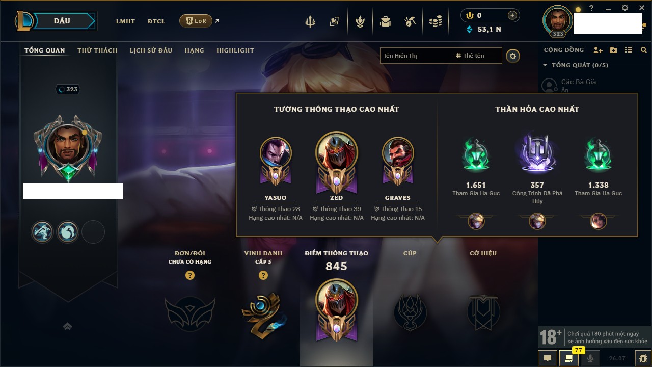 Rank Đơn: Chưa rank mùa nàoKhung: Chưa có khungTướng: 6 - Còn 7350 THXTrang Phục: 0Rank ĐTCL: Chưa rank mùa nàoLinh Thú: 30