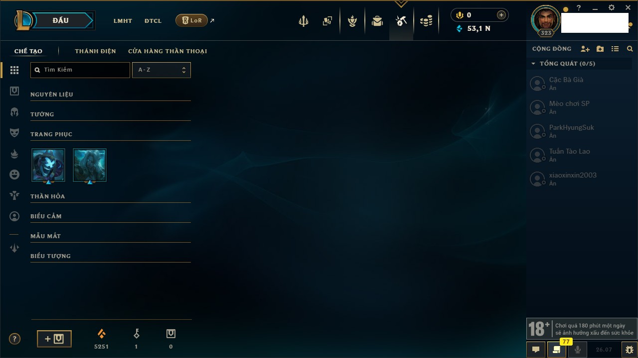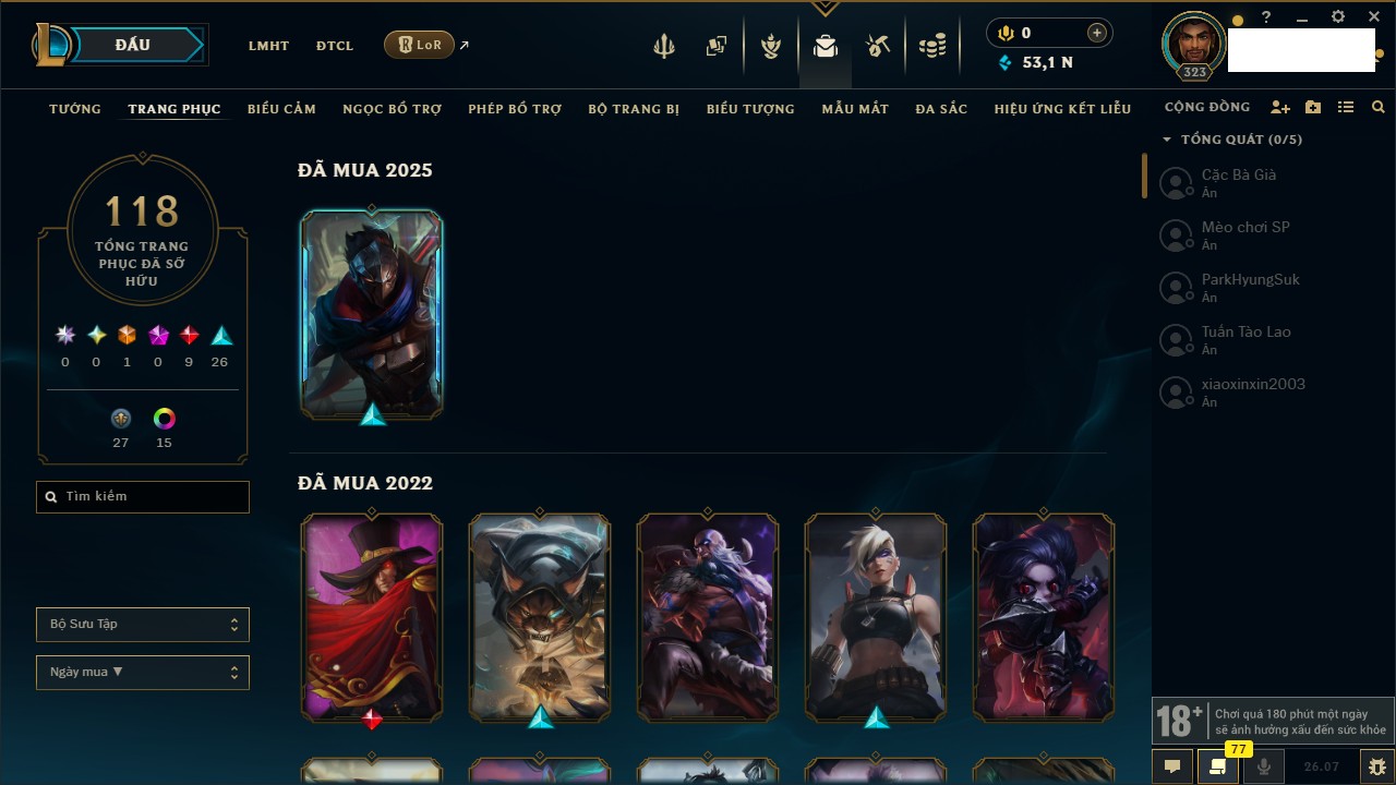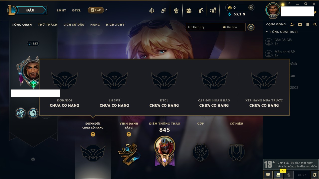Rank Đơn: Chưa RankKhung: Chưa có khungTướng: 166 - Còn 53123 THXTrang Phục: 118Rank ĐTCL: Chưa RankLinh Thú: 37