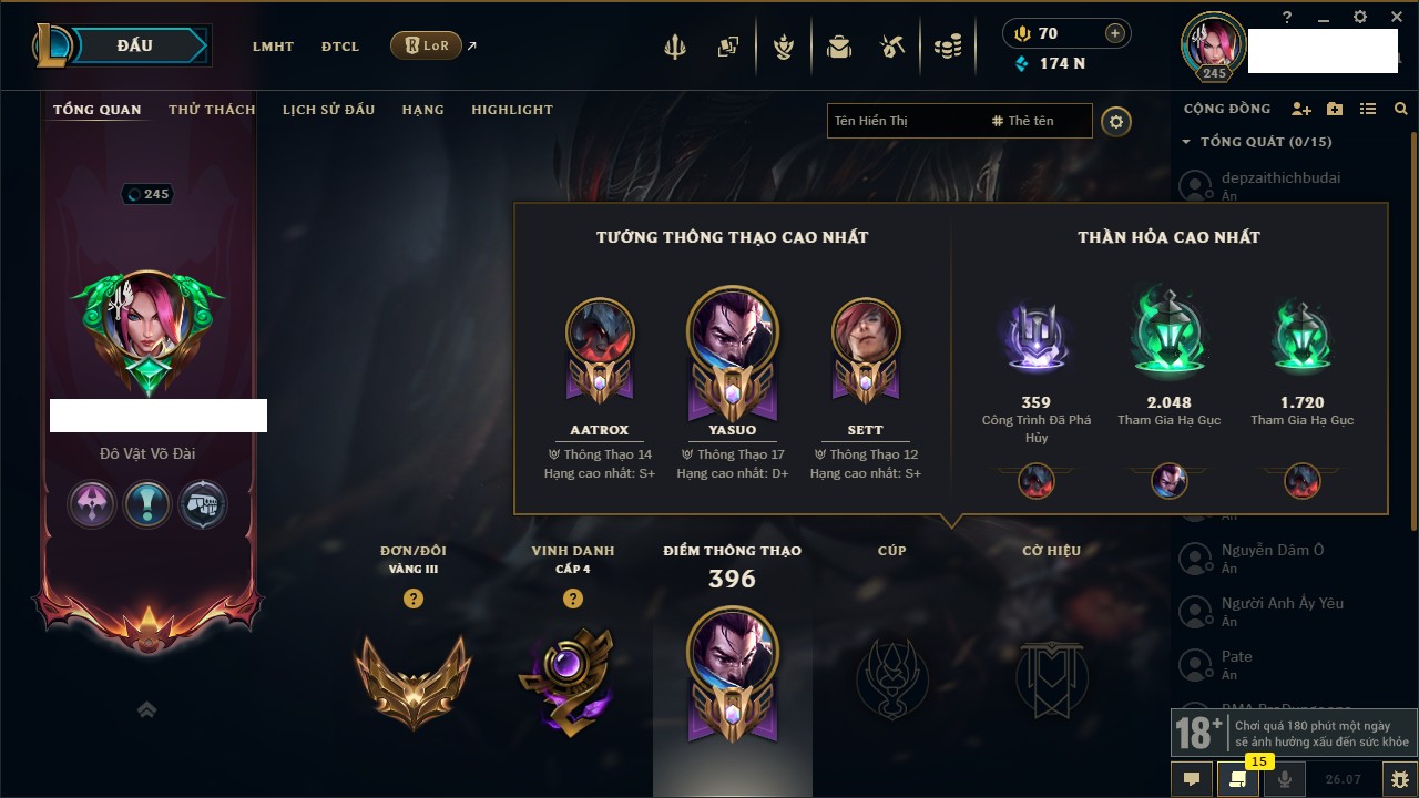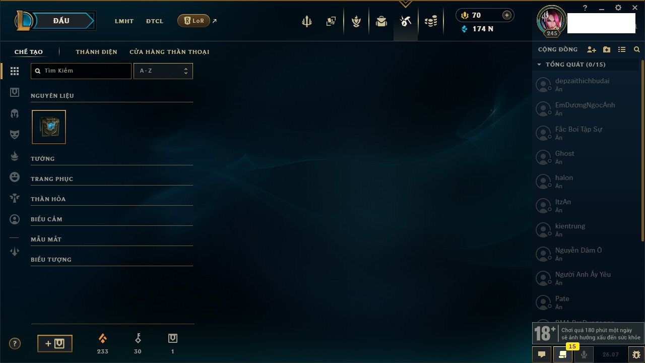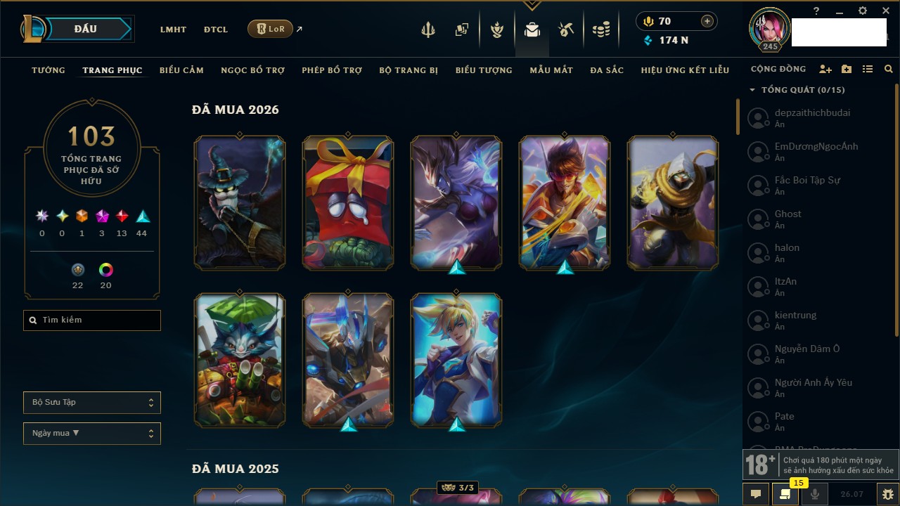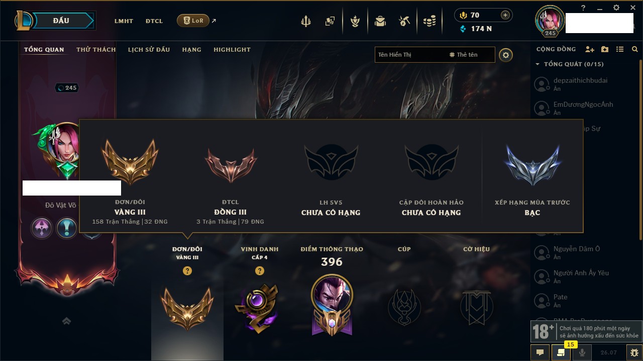 Rank Đơn: Vàng IIIKhung: Chưa có khungTướng: 169 - Còn 114624 THXTrang Phục: 86Rank ĐTCL: Chưa RankLinh Thú: 115