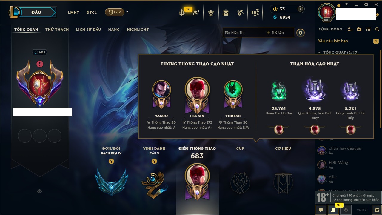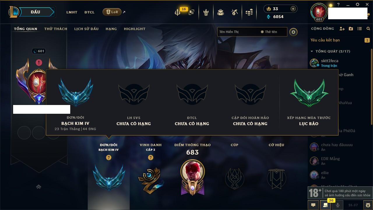 Rank Đơn: Bạch Kim IVKhung: Lục BảoTướng: 171 - Còn 6054 THXTrang Phục: 221Rank ĐTCL: Chưa RankLinh Thú: 145