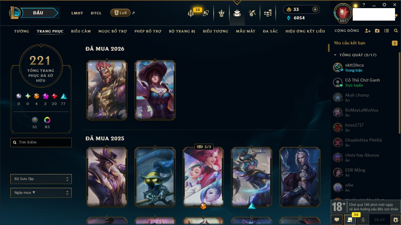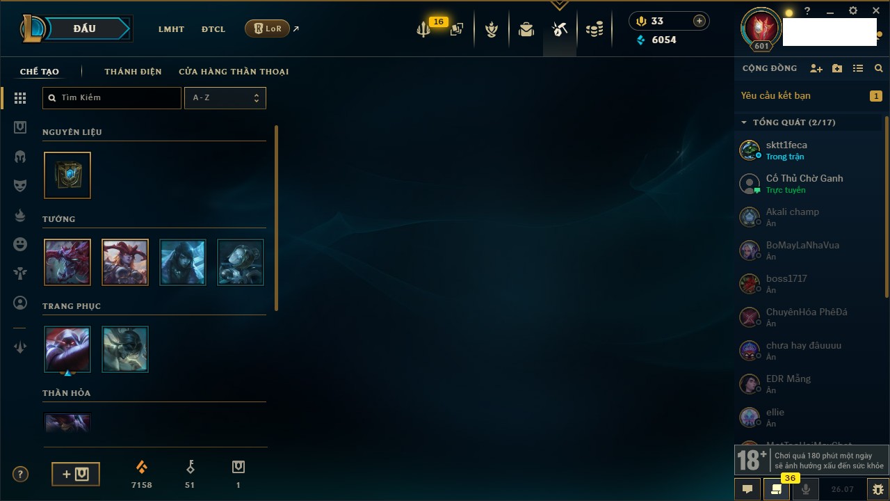 Rank Đơn: Chưa RankKhung: Chưa có khungTướng: 169 - Còn 43188 THXTrang Phục: 205Rank ĐTCL: Chưa RankLinh Thú: 259