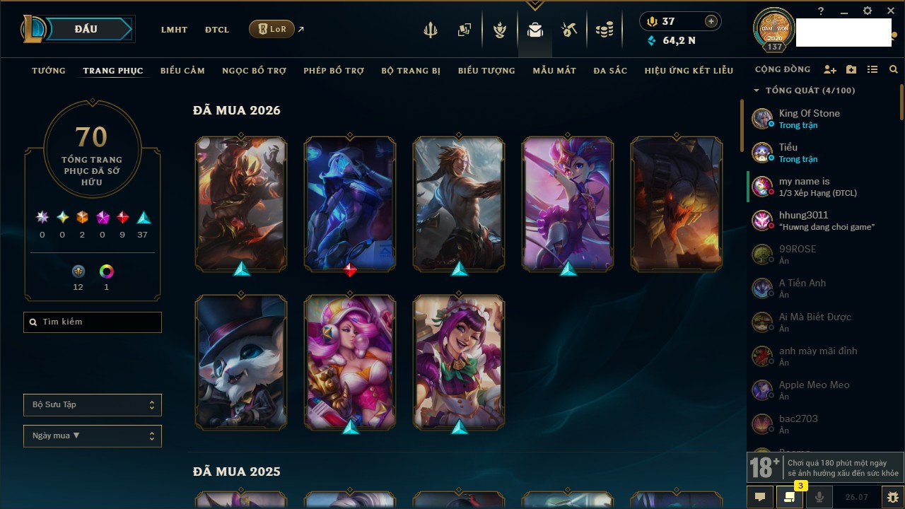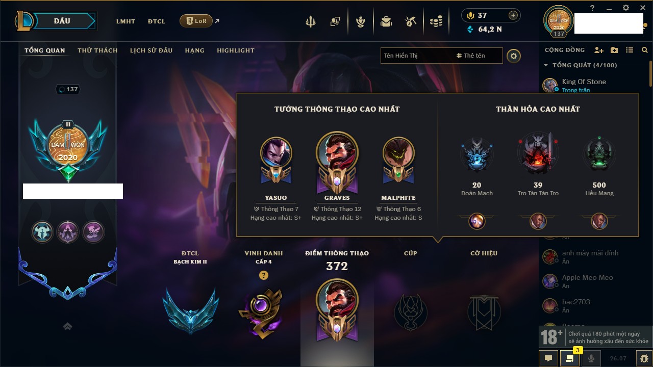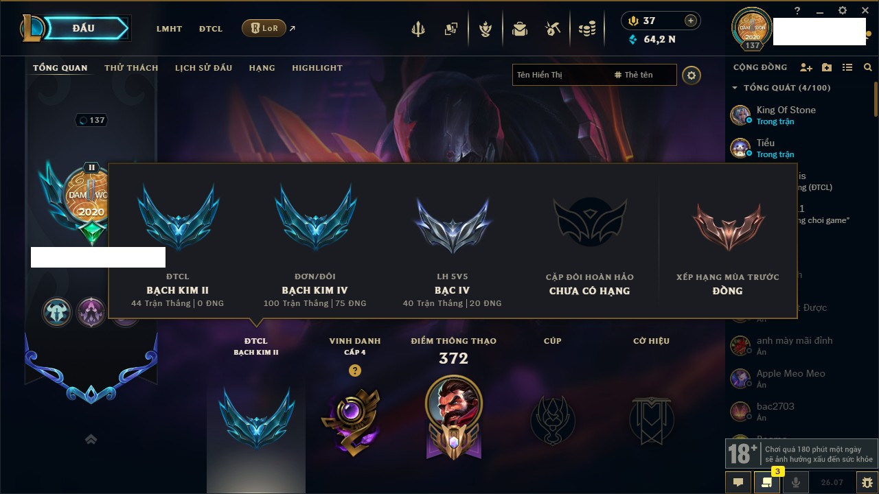 Rank Đơn: Vàng IIIKhung: Bạch kimTướng: 152 - Còn 97790 THXTrang Phục: 219Rank ĐTCL: Chưa RankLinh Thú: 26