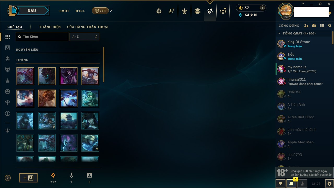 Rank Đơn: Chưa RankKhung: Chưa có khungTướng: 171 - Còn 508607 THXTrang Phục: 202Rank ĐTCL: Chưa RankLinh Thú: 92