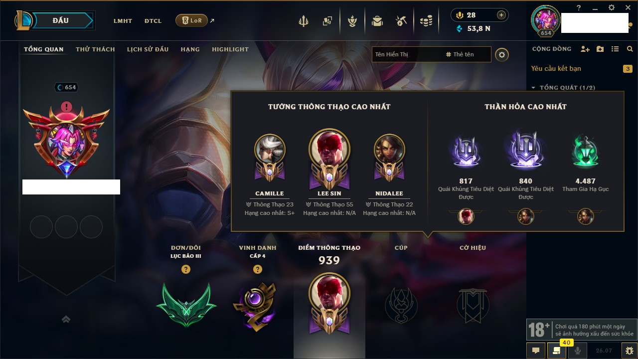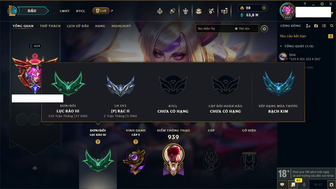 Rank Đơn: Bạc IV Khung: Chưa có khung Tướng: 172 - Còn 6276 THX Trang Phục: 187 Rank ĐTCL: Vàng II Linh Thú: 142