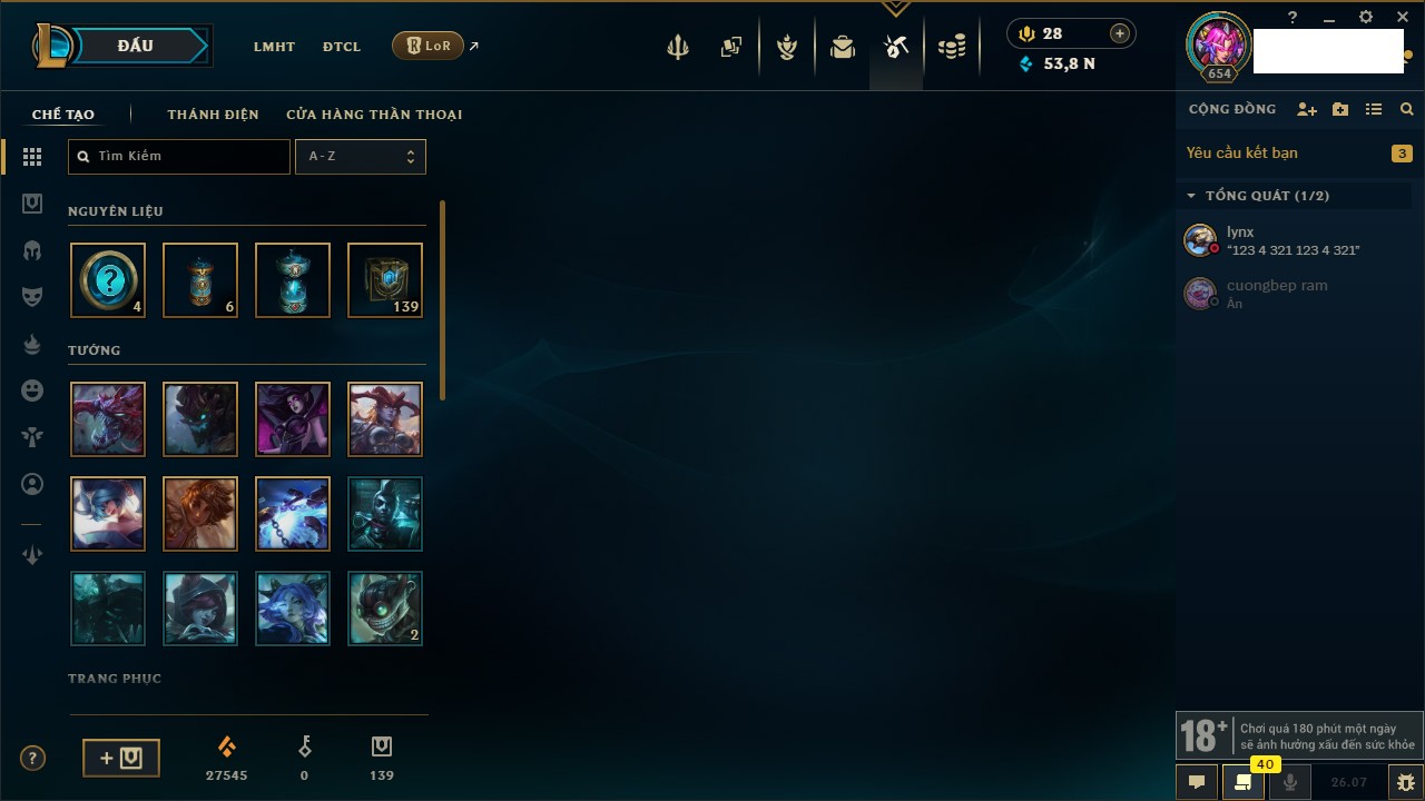 Rank Đơn: Chưa Rank Khung: Chưa có khung Tướng: 169 - Còn 15524 THX Trang Phục: 175 Rank ĐTCL: Chưa Rank Linh Thú: 389