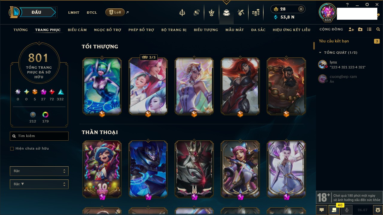Rank Đơn: Chưa Rank Khung: Chưa có khung Tướng: 172 - Còn 52306 THX Trang Phục: 78 Rank ĐTCL: Rank Cao Thủ Linh Thú: 211