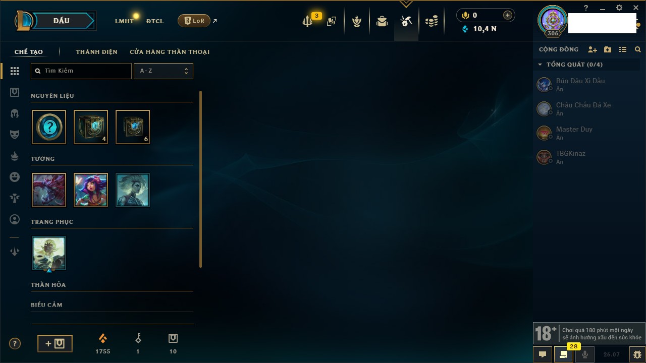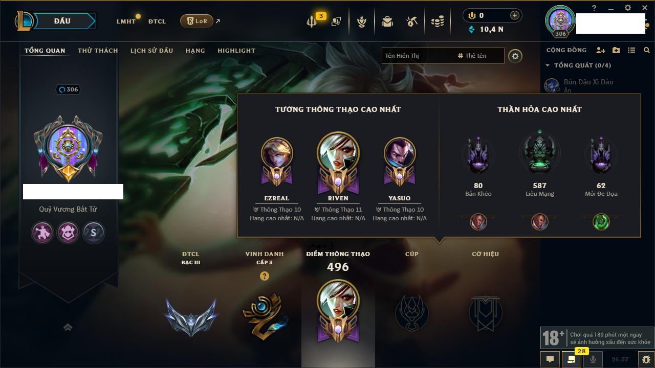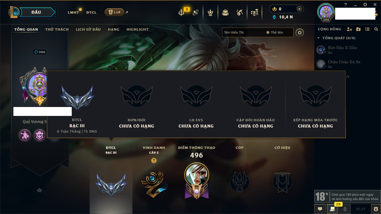 Rank Đơn: Chưa RankKhung: Chưa có khungTướng: 142 - Còn 10434 THXTrang Phục: 160Rank ĐTCL: Bạc IIILinh Thú: 39