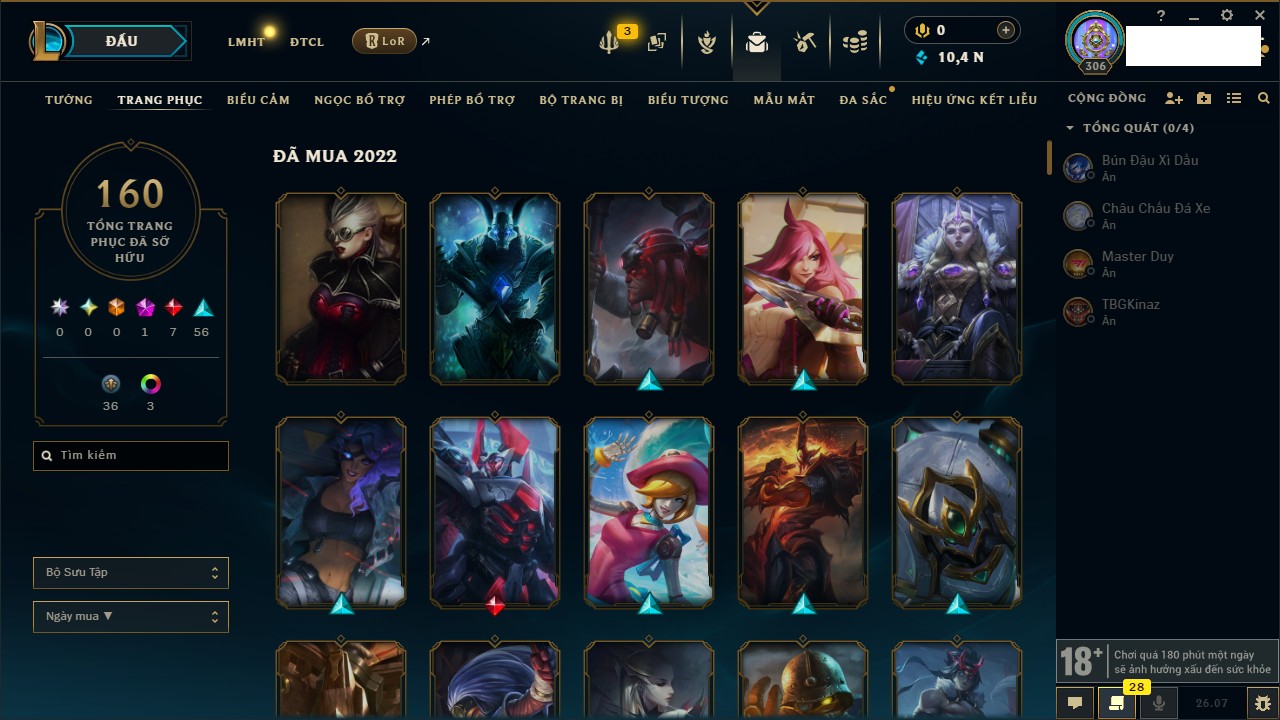 Rank Đơn: Chưa RankKhung: Chưa có khungTướng: 160 - Còn 17416 THXTrang Phục: 137Rank ĐTCL: Chưa RankLinh Thú: 24