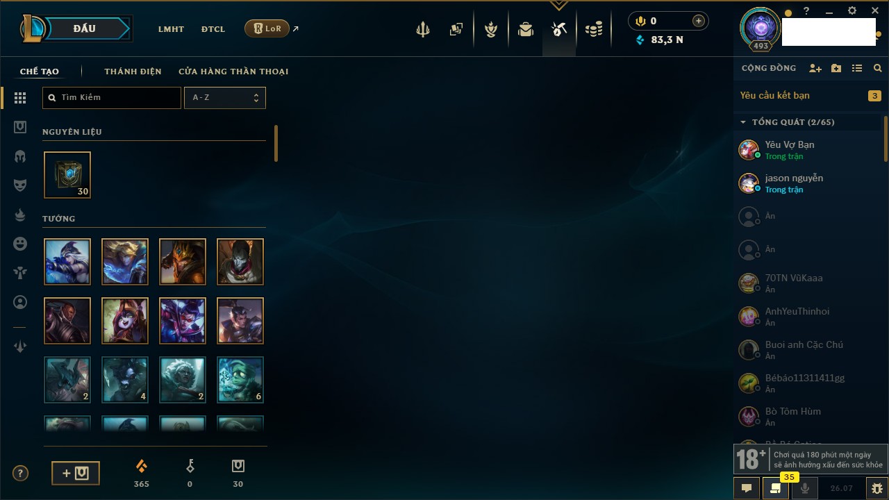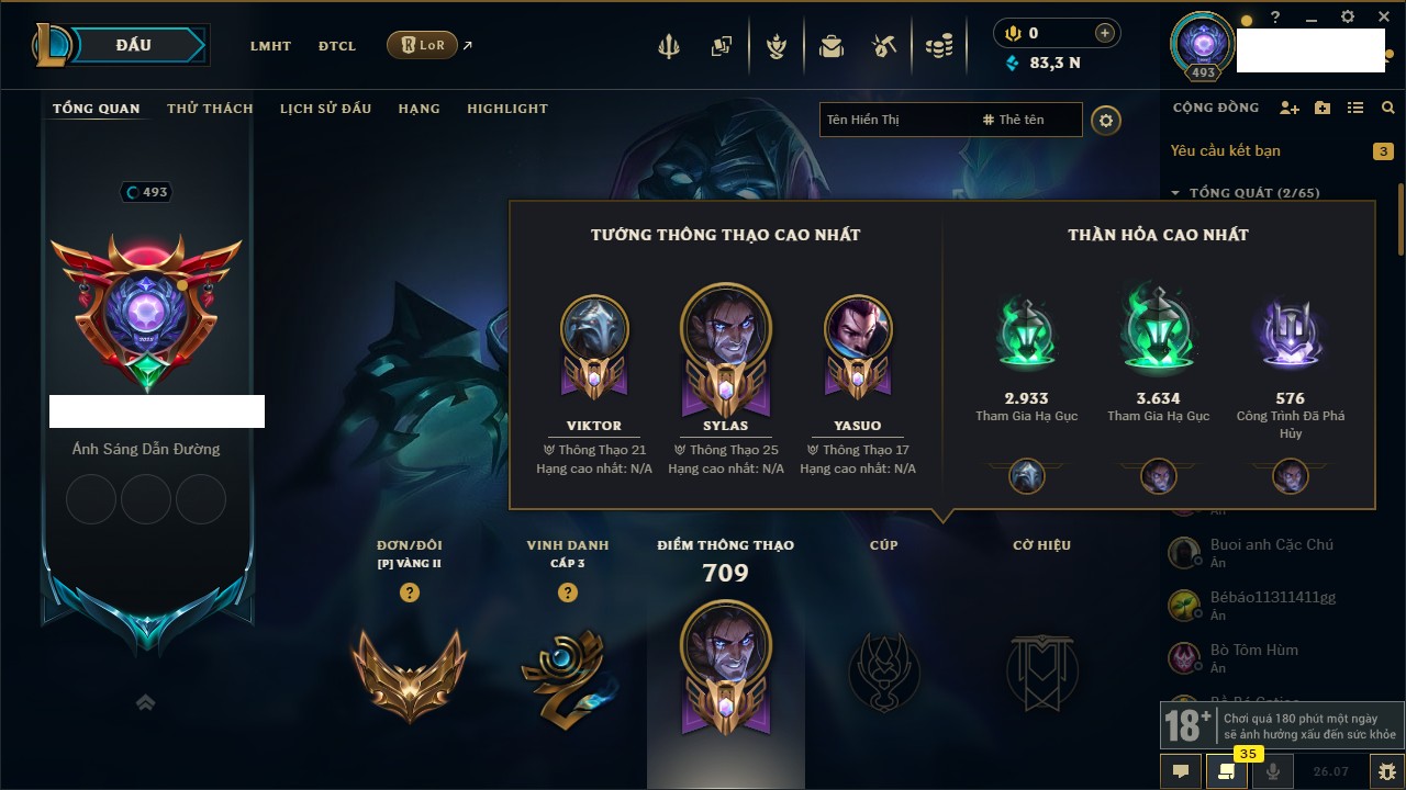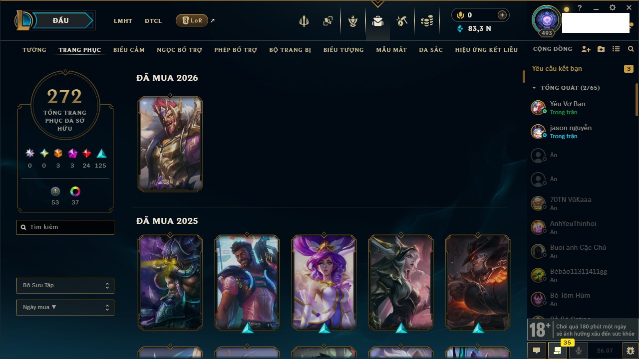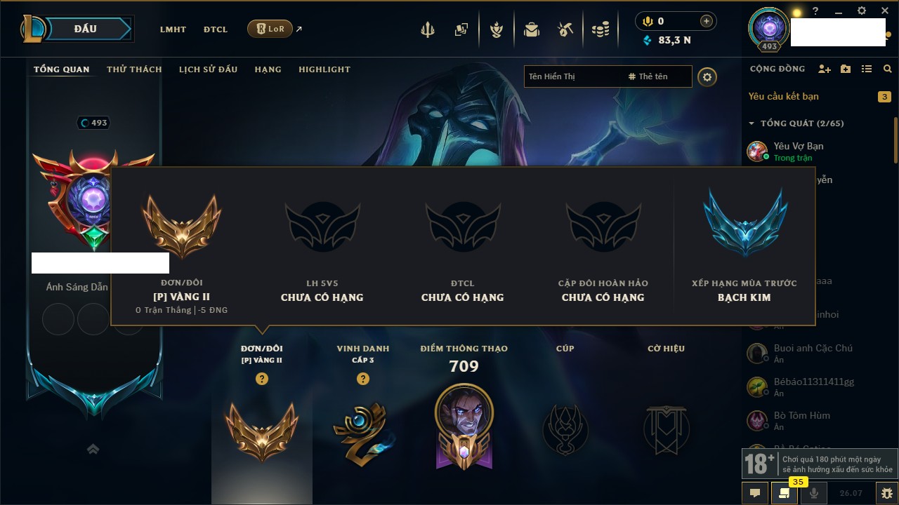 Rank Đơn: Vàng IIKhung: Bạch kimTướng: 172 - Còn 83355 THXTrang Phục: 272Rank ĐTCL: Chưa RankLinh Thú: 38