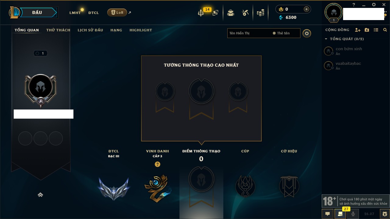 Rank Đơn: Chưa rank mùa nàoKhung: Chưa có khungTướng: 5 - Còn 6300 THXTrang Phục: 0Rank ĐTCL: Bạc IIILinh Thú: 17