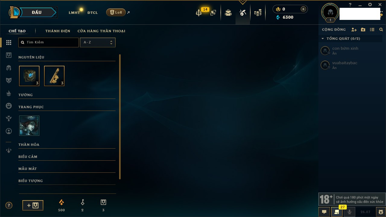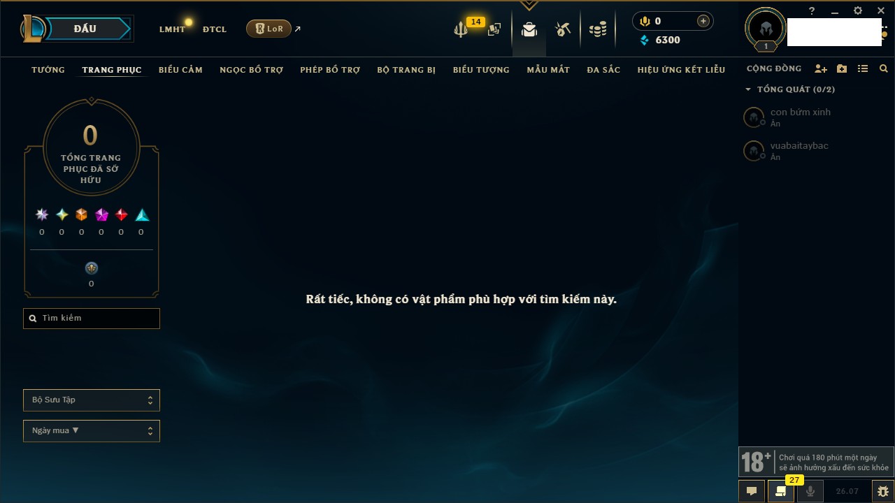 Rank Đơn: Chưa rank mùa nàoKhung: Chưa có khungTướng: 160 - Còn 7629 THXTrang Phục: 5Rank ĐTCL: Chưa RankLinh Thú: 19
