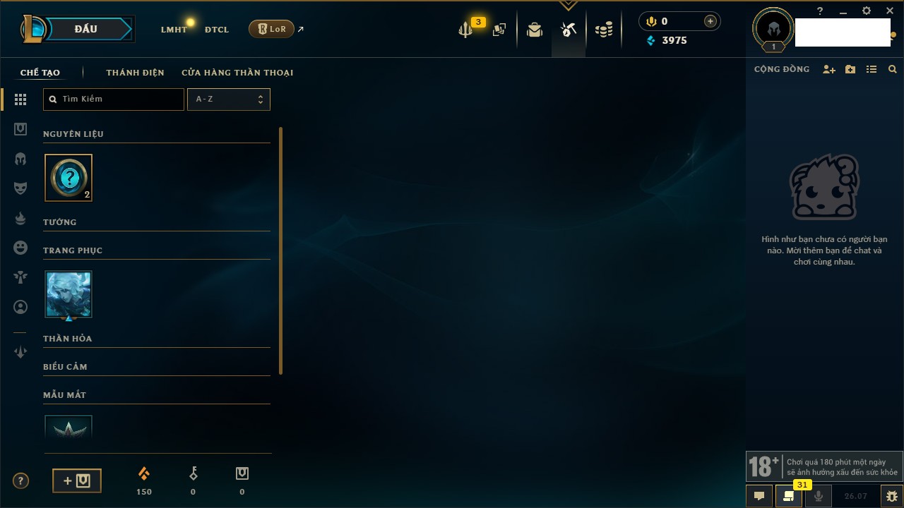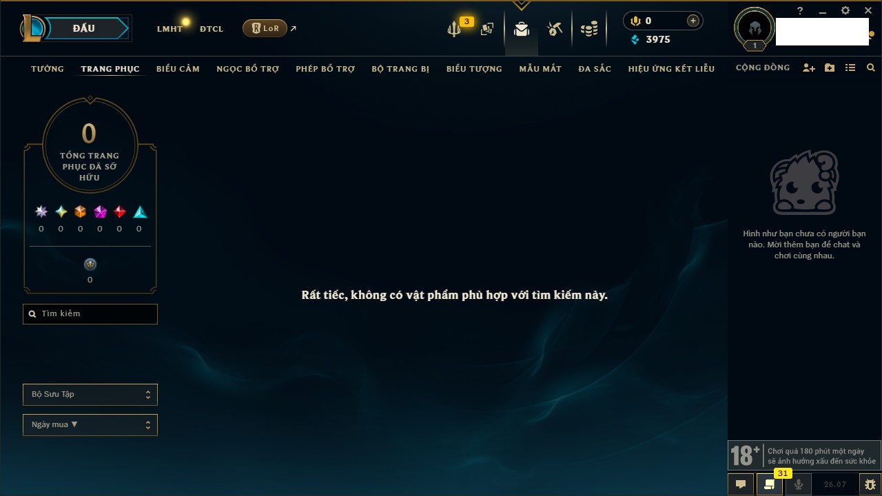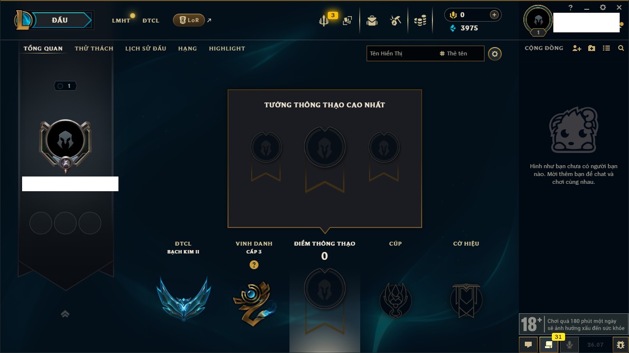 Rank Đơn: Chưa rank mùa nàoKhung: Chưa có khungTướng: 0 - Còn 15550 THXTrang Phục: 0Rank ĐTCL: Chưa rank mùa nàoLinh Thú: 18