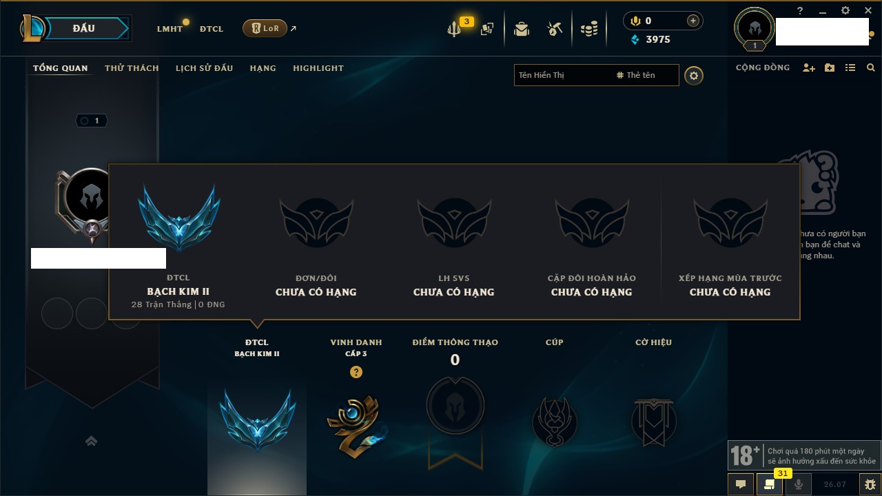 Rank Đơn: Chưa rank mùa nàoKhung: Chưa có khungTướng: 4 - Còn 3975 THXTrang Phục: 0Rank ĐTCL: Bạch Kim IILinh Thú: 11