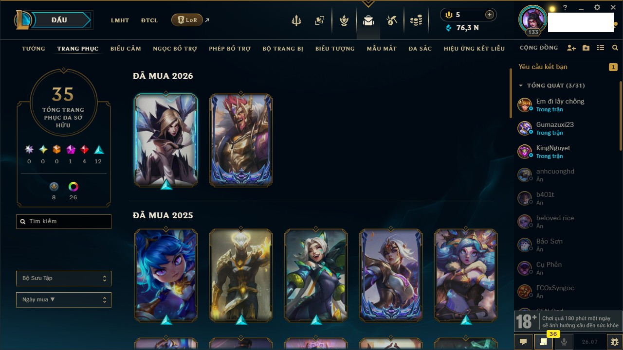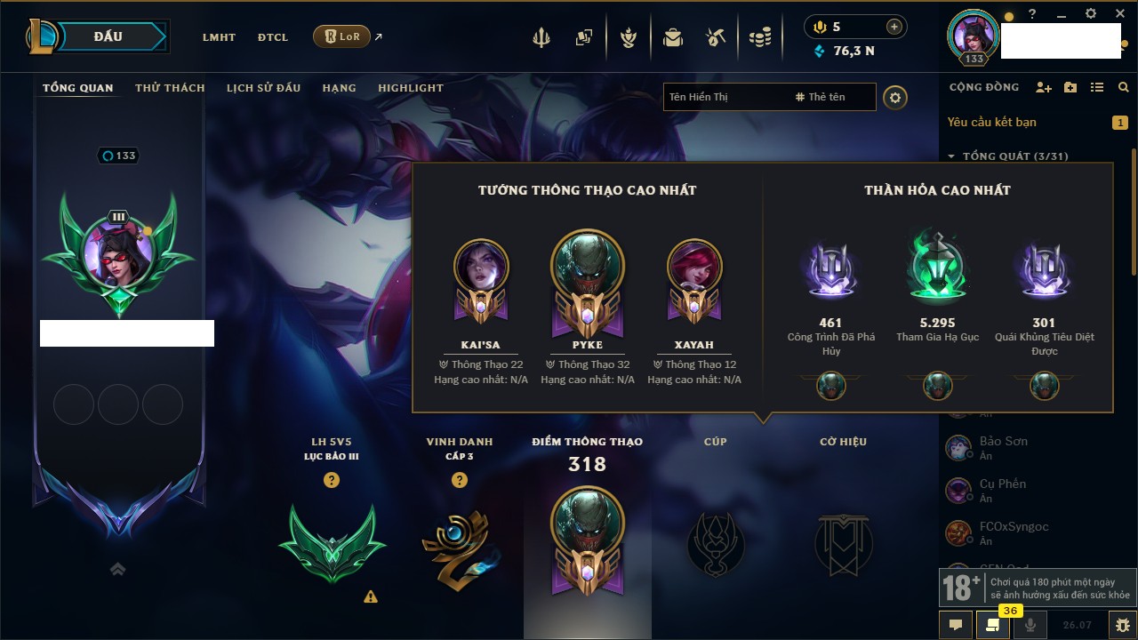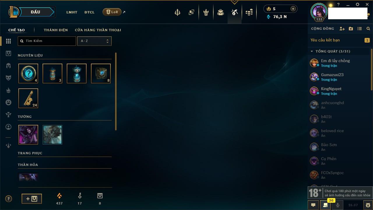 Rank Đơn: Bạch Kim IVKhung: Lục BảoTướng: 122 - Còn 76386 THXTrang Phục: 35Rank ĐTCL: Chưa RankLinh Thú: 113