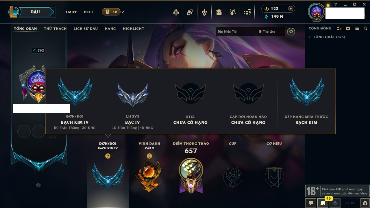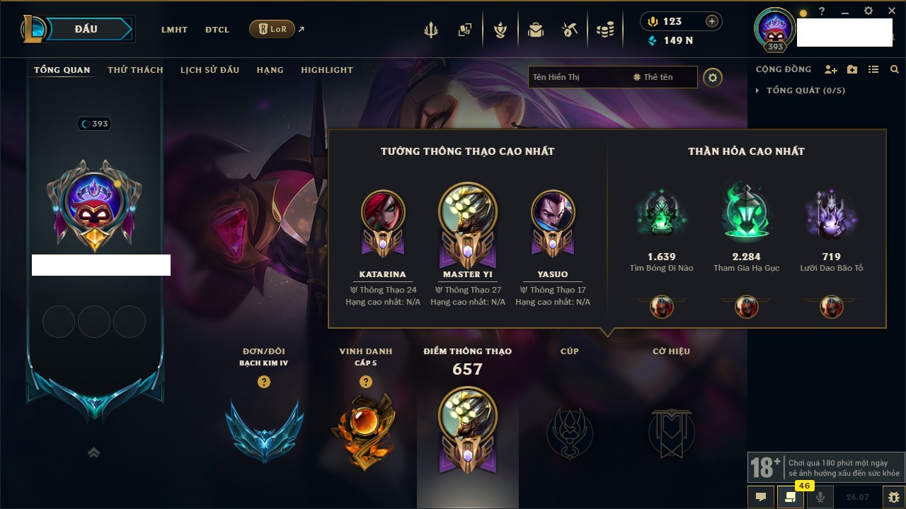 Rank Đơn: Bạch Kim IVKhung: SắtTướng: 172 - Còn 149459 THXTrang Phục: 267Rank ĐTCL: Chưa RankLinh Thú: 143
