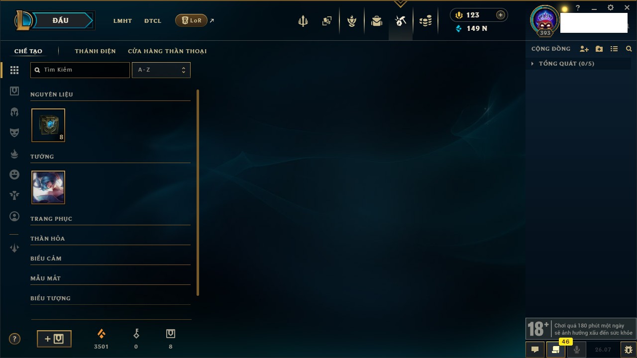 Rank Đơn: Chưa RankKhung: Chưa có khungTướng: 171 - Còn 827961 THXTrang Phục: 193Rank ĐTCL: Chưa RankLinh Thú: 63
