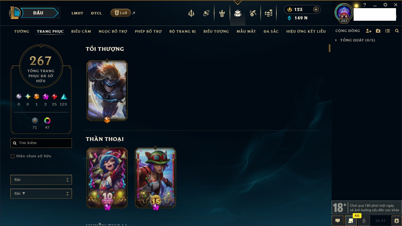 Rank Đơn: Chưa RankKhung: VàngTướng: 171 - Còn 660284 THXTrang Phục: 199Rank ĐTCL: Chưa RankLinh Thú: 34
