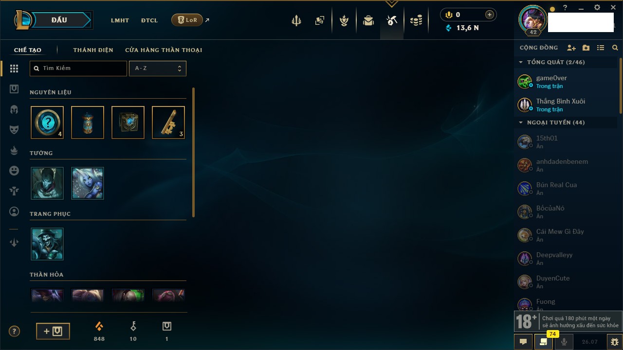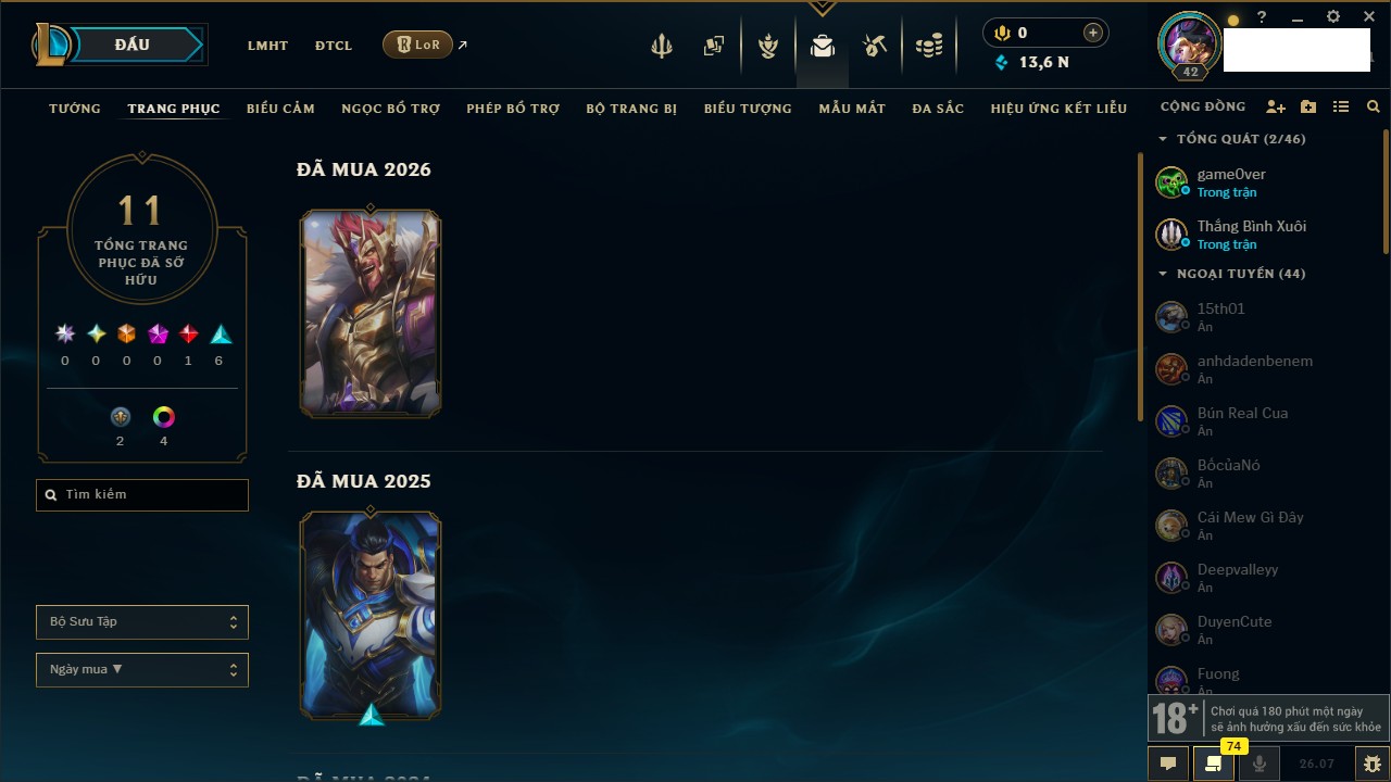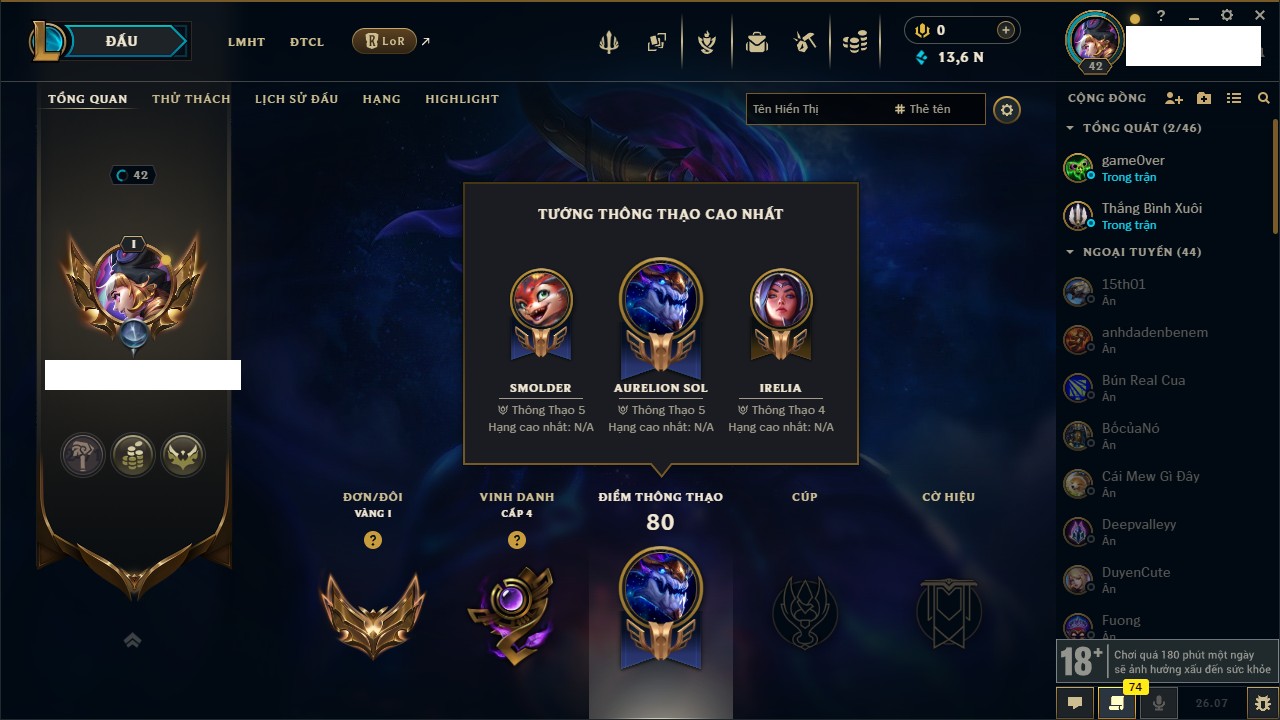 Rank Đơn: Vàng IKhung: VàngTướng: 65 - Còn 13685 THXTrang Phục: 11Rank ĐTCL: Chưa RankLinh Thú: 67