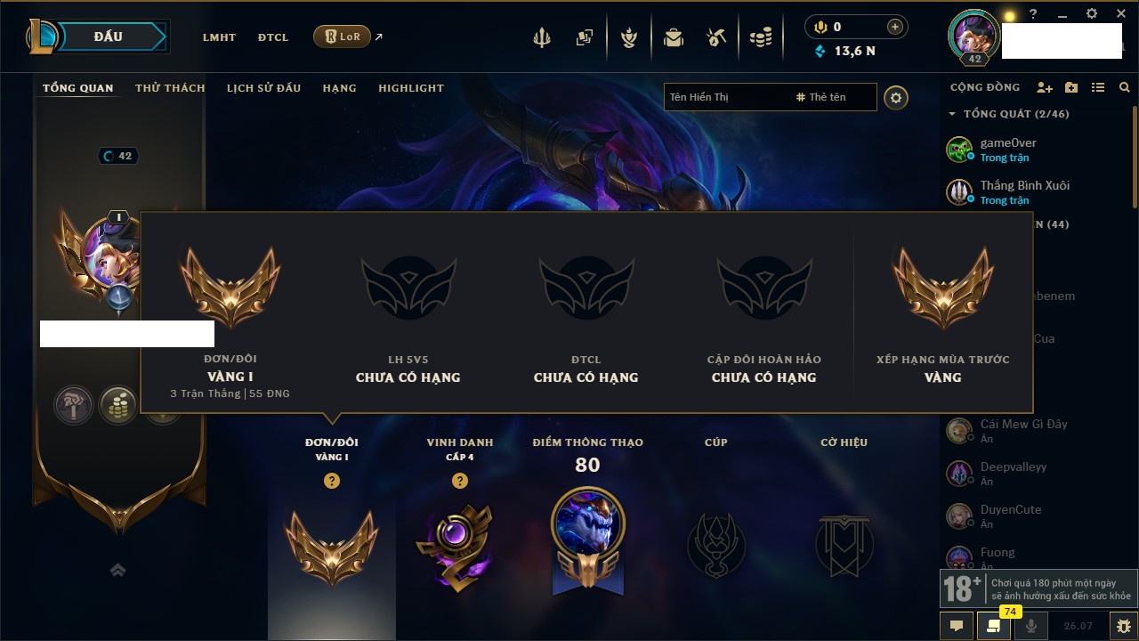 Rank Đơn: Bạc IKhung: VàngTướng: 90 - Còn 190 THXTrang Phục: 15Rank ĐTCL: Vàng IIILinh Thú: 70