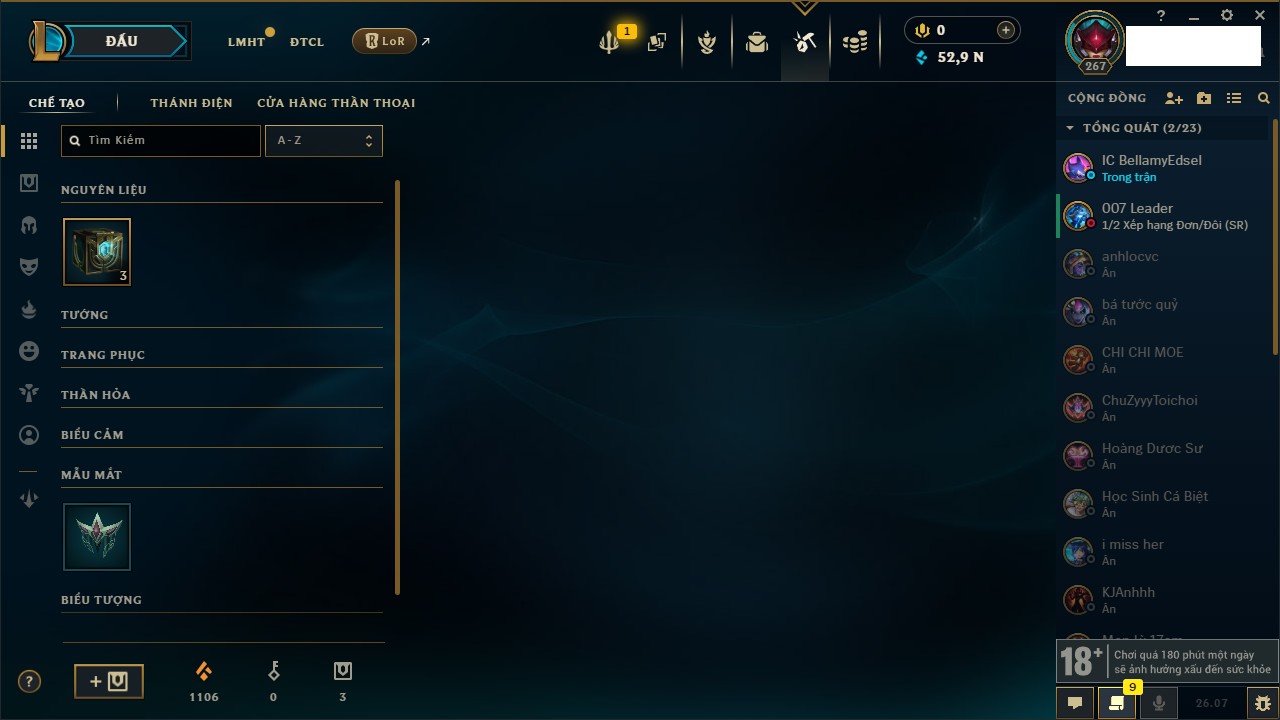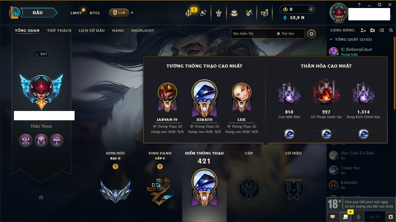 Rank Đơn: Chưa RankKhung: Bạch kimTướng: 171 - Còn 54673 THXTrang Phục: 196Rank ĐTCL: Chưa RankLinh Thú: 100