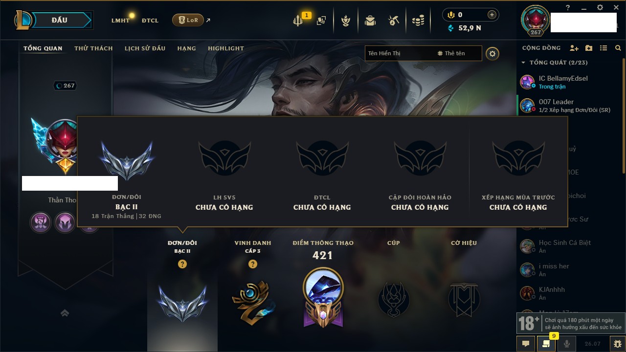 Rank Đơn: Bạc IIKhung: Chưa có khungTướng: 172 - Còn 52966 THXTrang Phục: 187Rank ĐTCL: Chưa RankLinh Thú: 50