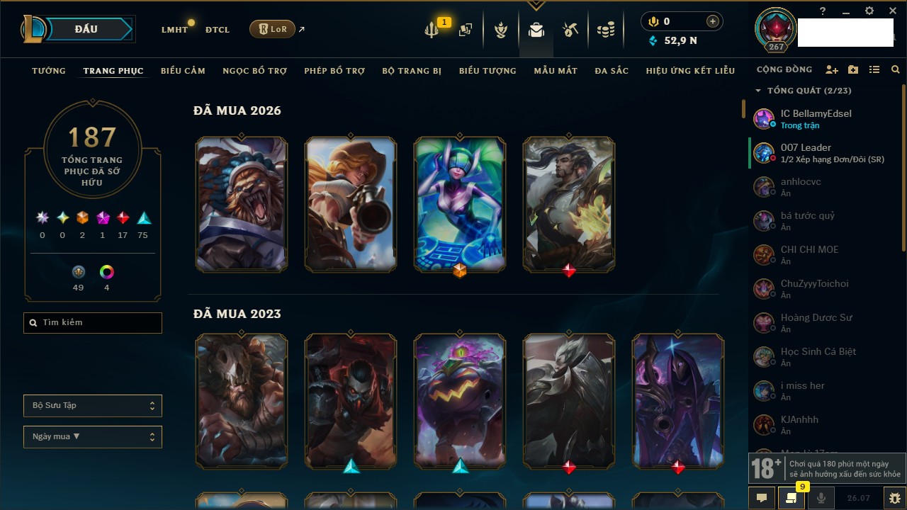 Rank Đơn: Vàng IIIKhung: Chưa có khungTướng: 166 - Còn 1354 THXTrang Phục: 178Rank ĐTCL: Chưa RankLinh Thú: 18