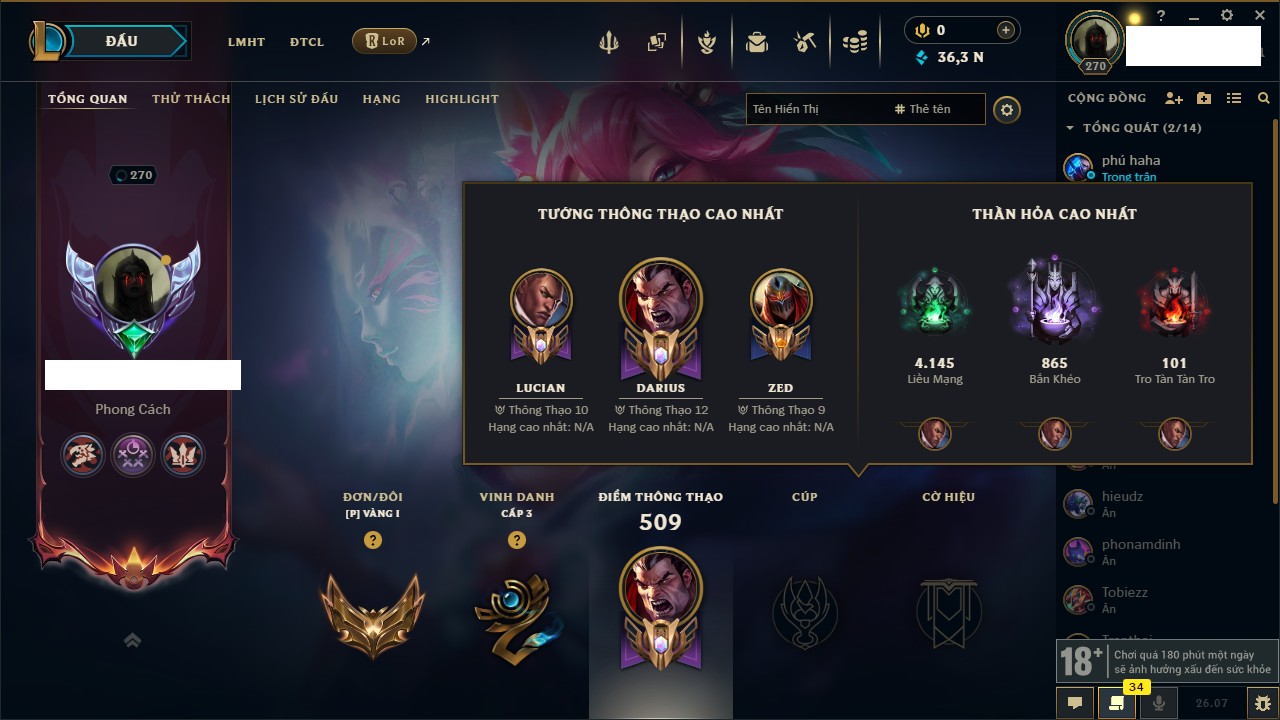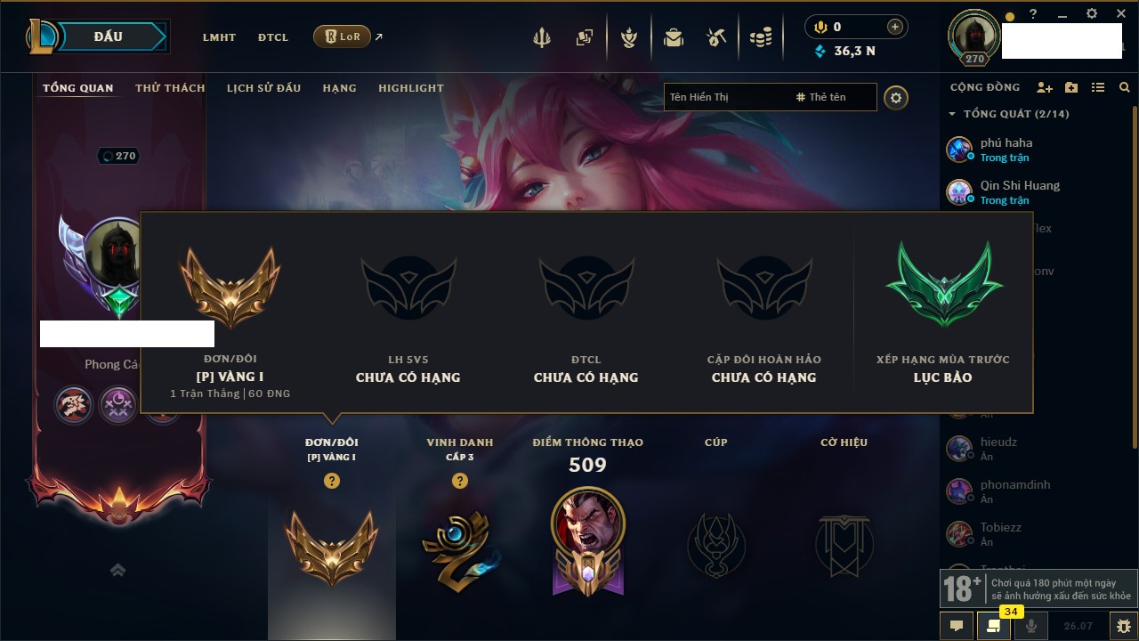 Rank Đơn: Vàng IIIKhung: Bạch kimTướng: 152 - Còn 97790 THXTrang Phục: 219Rank ĐTCL: Chưa RankLinh Thú: 26