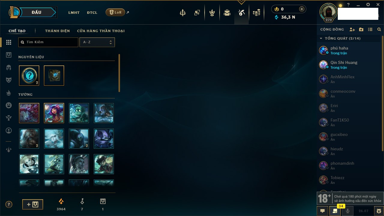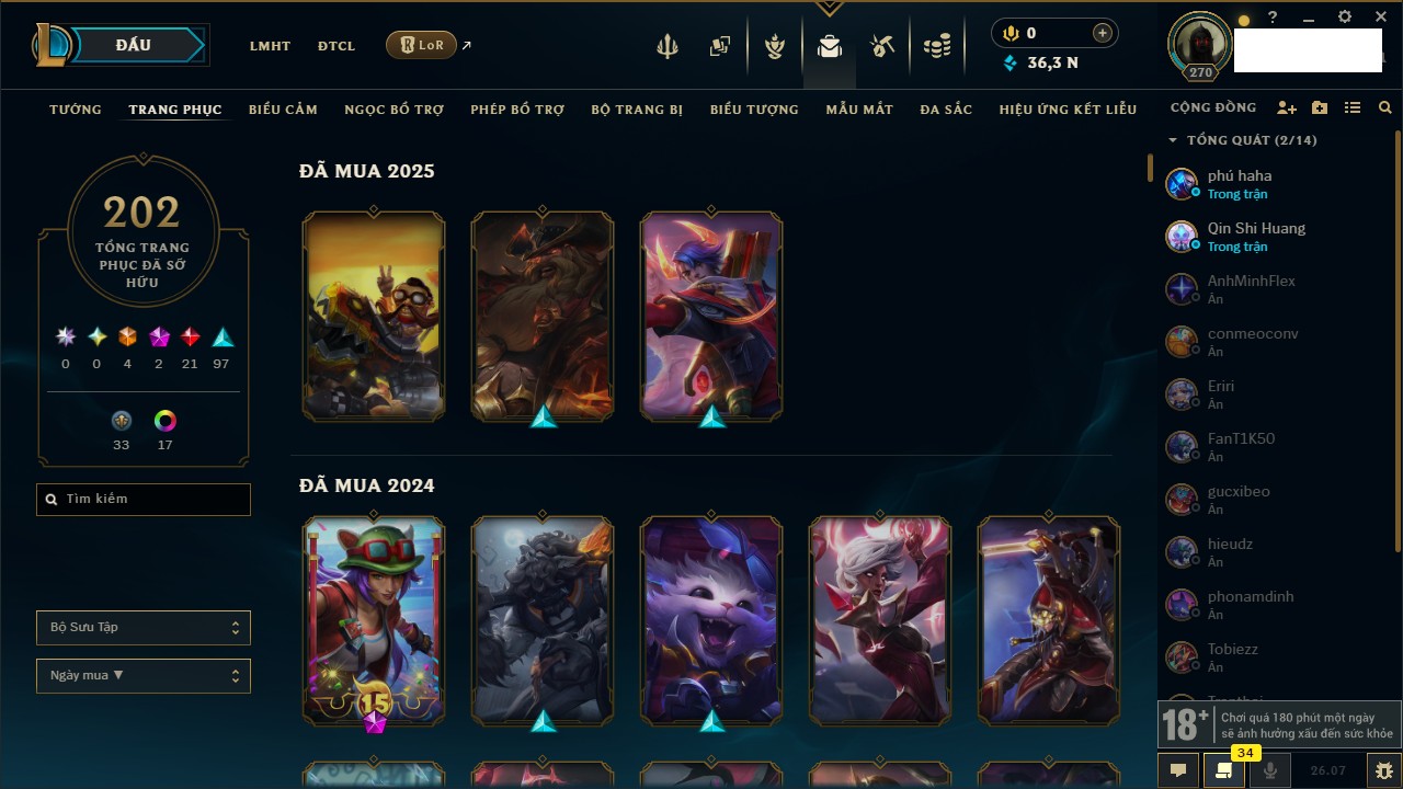 Rank Đơn: Vàng IKhung: Bạch kimTướng: 171 - Còn 36362 THXTrang Phục: 202Rank ĐTCL: Chưa RankLinh Thú: 121