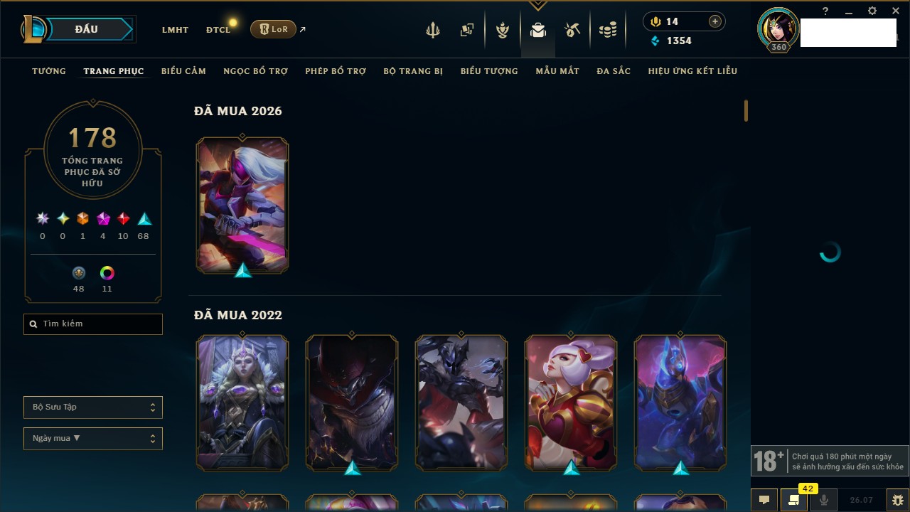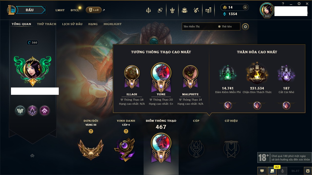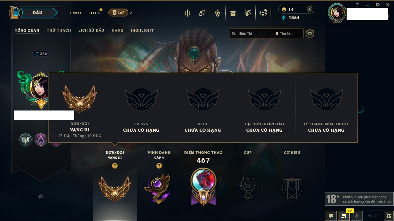 Rank Đơn: Vàng IIIKhung: Chưa có khungTướng: 166 - Còn 1354 THXTrang Phục: 178Rank ĐTCL: Chưa RankLinh Thú: 18