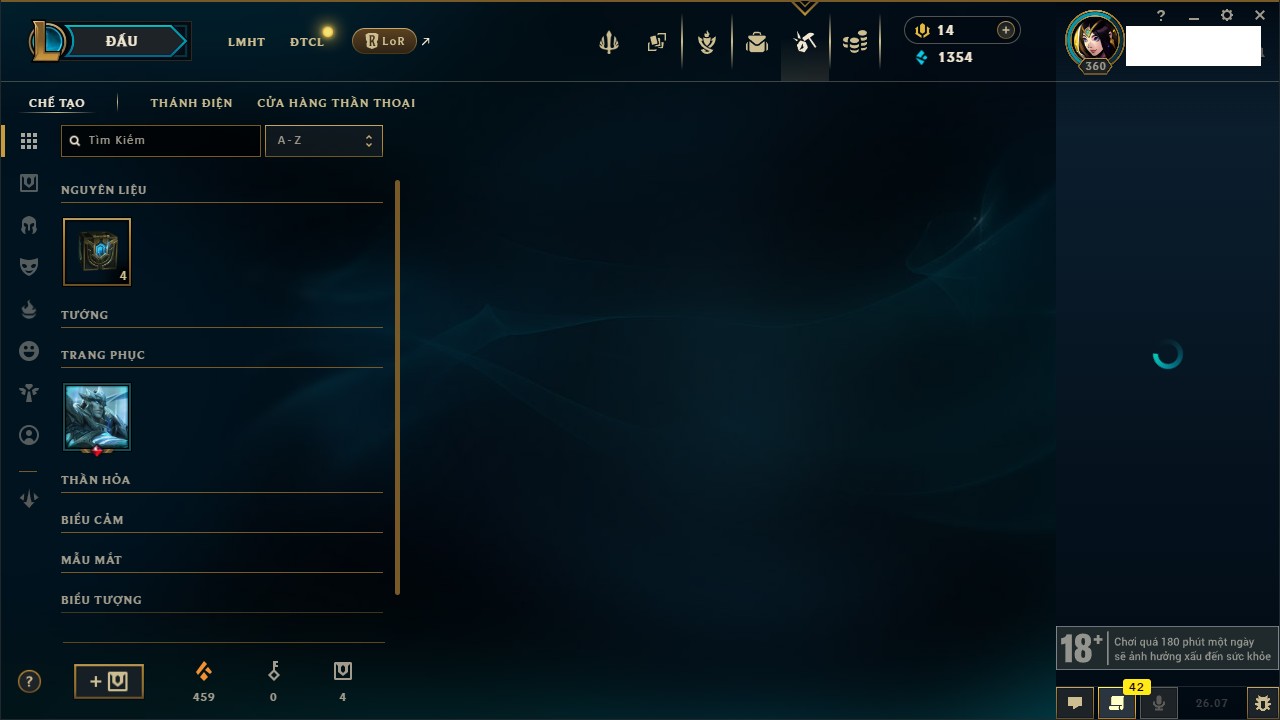 Rank Đơn: Chưa RankKhung: Bạch kimTướng: 171 - Còn 54673 THXTrang Phục: 196Rank ĐTCL: Chưa RankLinh Thú: 100