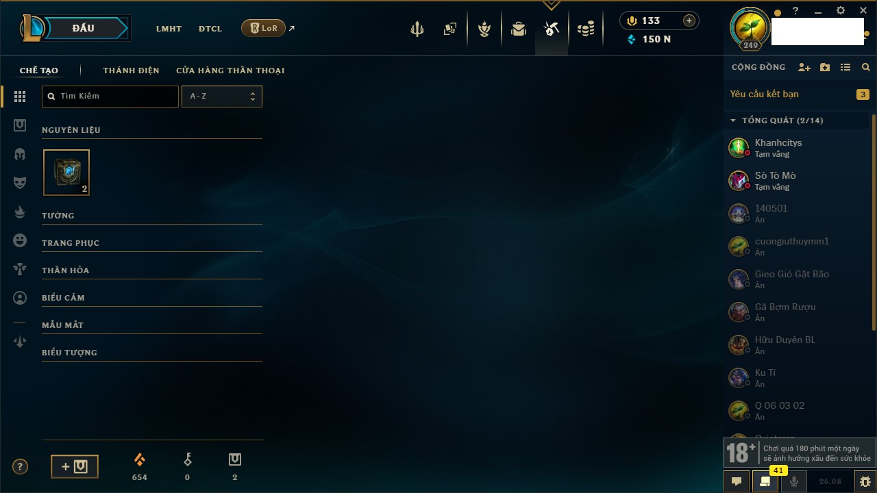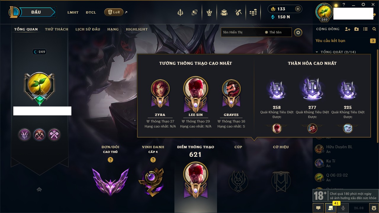 Rank Đơn: Bạch Kim IIKhung: Chưa có khungTướng: 172 - Còn 21267 THXTrang Phục: 218Rank ĐTCL: Chưa RankLinh Thú: 47