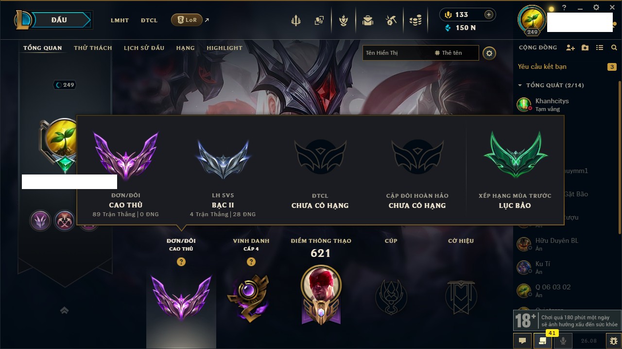 Rank Đơn: Rank Cao ThủKhung: Lục BảoTướng: 161 - Còn 150815 THXTrang Phục: 134Rank ĐTCL: Chưa RankLinh Thú: 26