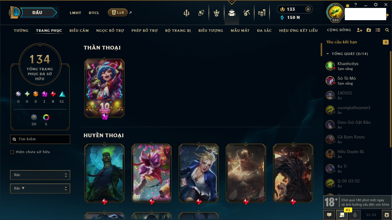 Rank Đơn: Chưa RankKhung: VàngTướng: 172 - Còn 155977 THXTrang Phục: 199Rank ĐTCL: Chưa RankLinh Thú: 108
