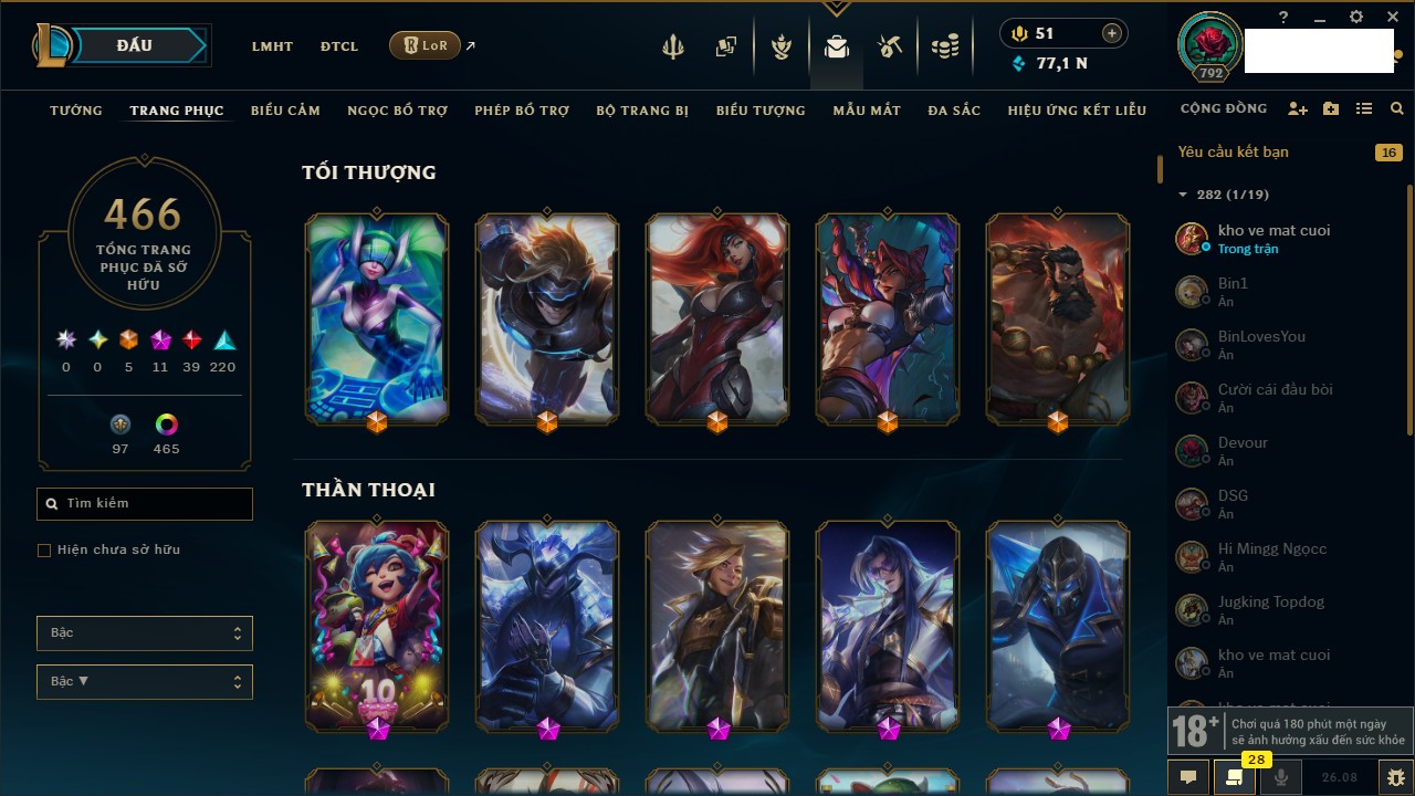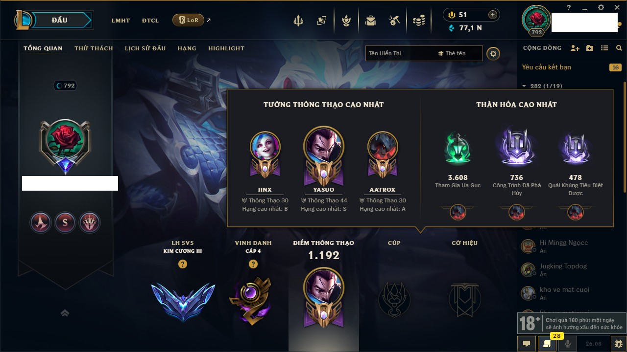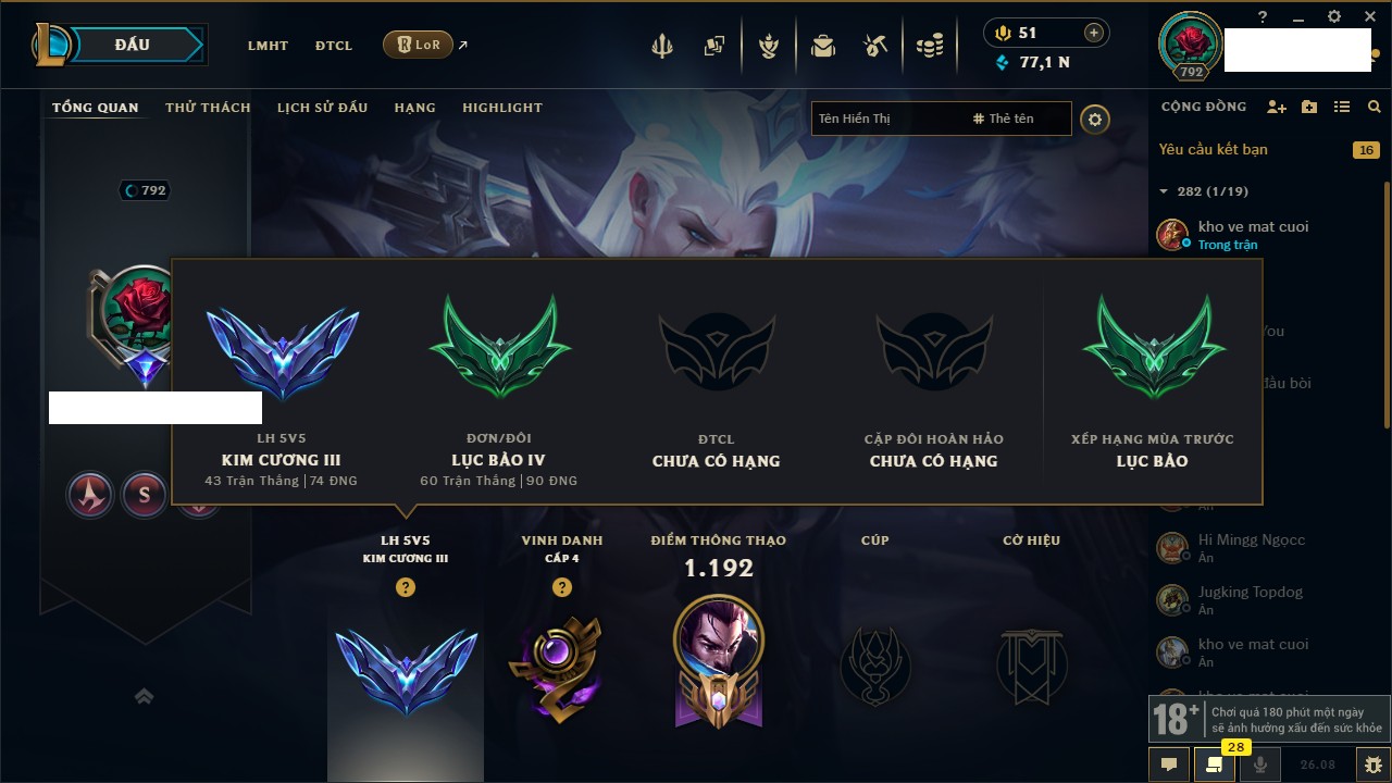 Rank Đơn: Chưa Rank Khung: Bạch kim Tướng: 172 - Còn 75152 THX Trang Phục: 551 Rank ĐTCL: Chưa Rank Linh Thú: 384