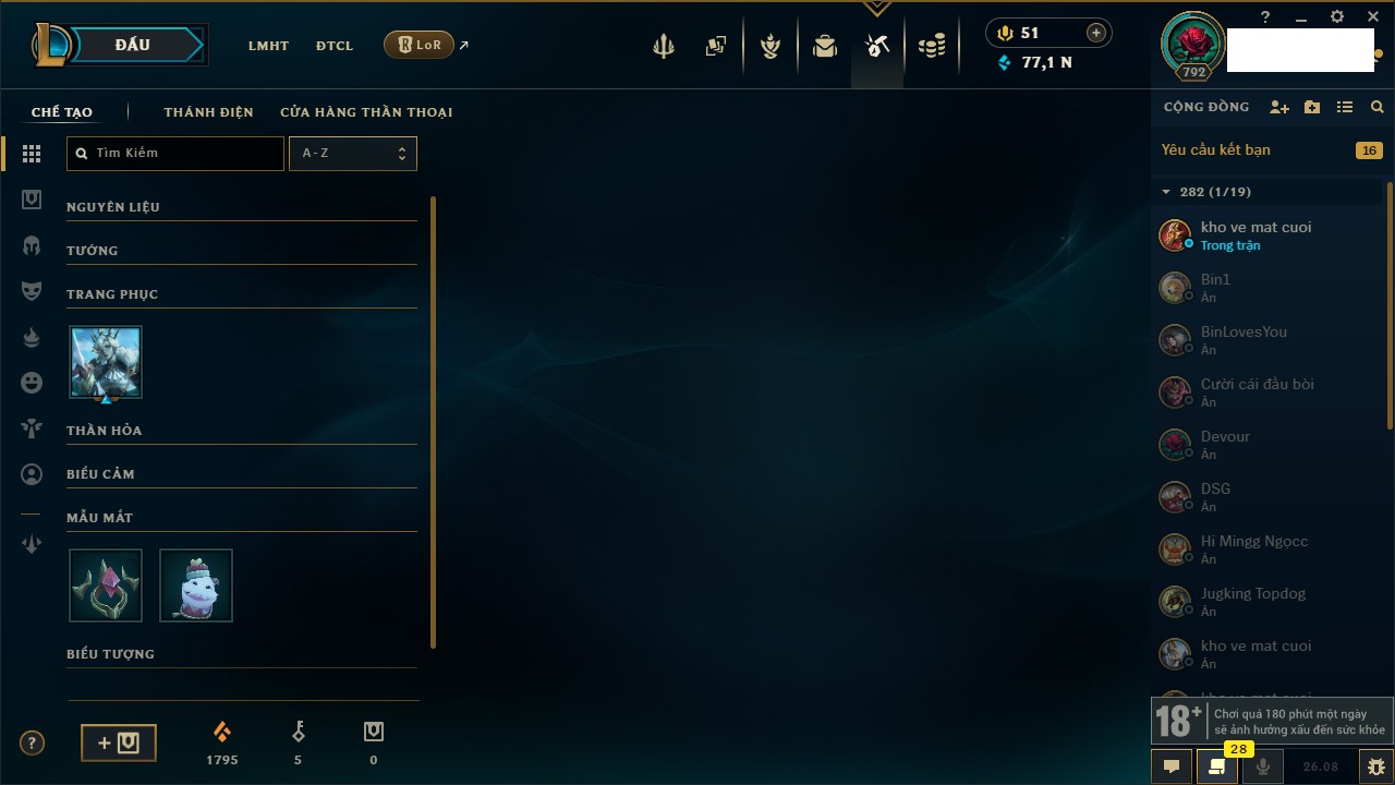 Rank Đơn: Chưa Rank Khung: Bạc Tướng: 170 - Còn 76209 THX Trang Phục: 614 Rank ĐTCL: Chưa Rank Linh Thú: 268