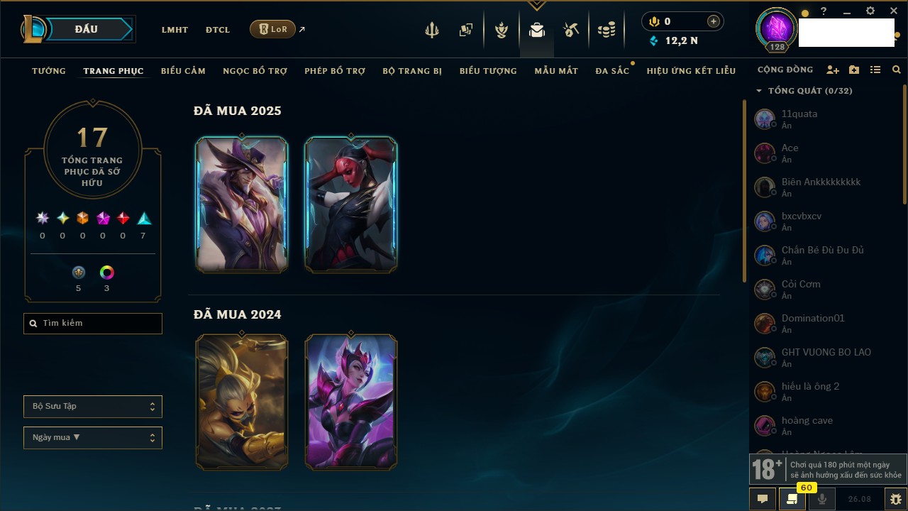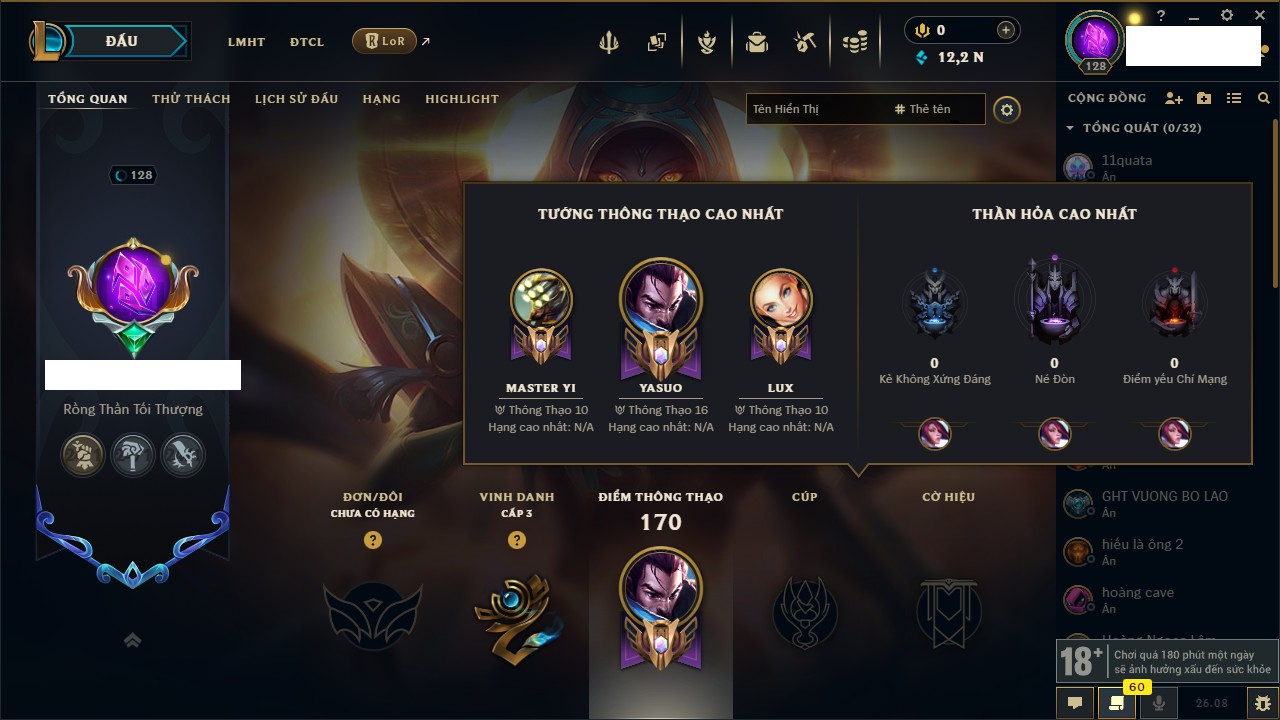 Rank Đơn: Chưa RankKhung: BạcTướng: 25 - Còn 11712 THXTrang Phục: 4Rank ĐTCL: Chưa RankLinh Thú: 2