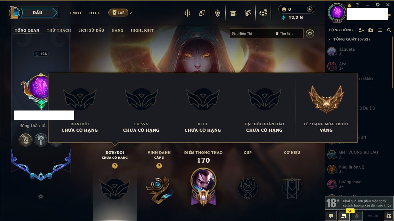 Rank Đơn: Chưa RankKhung: BạcTướng: 41 - Còn 6035 THXTrang Phục: 11Rank ĐTCL: Chưa RankLinh Thú: 8