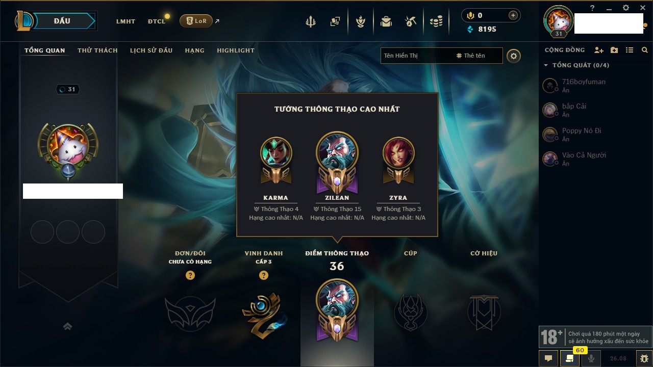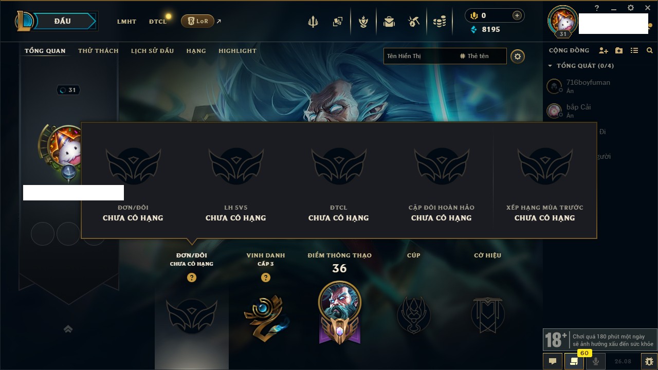 Rank Đơn: Chưa rank mùa nàoKhung: Chưa có khungTướng: 20 - Còn 8195 THXTrang Phục: 2Rank ĐTCL: Chưa RankLinh Thú: 2