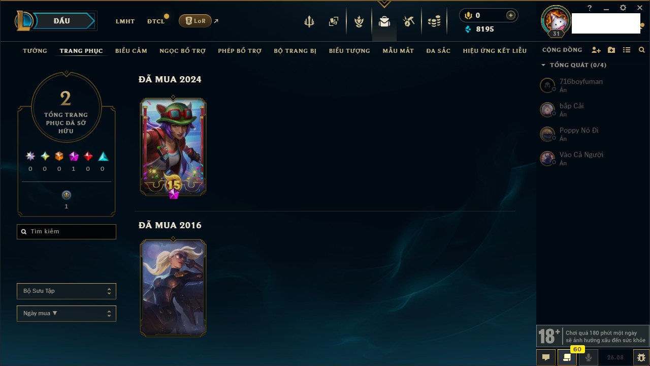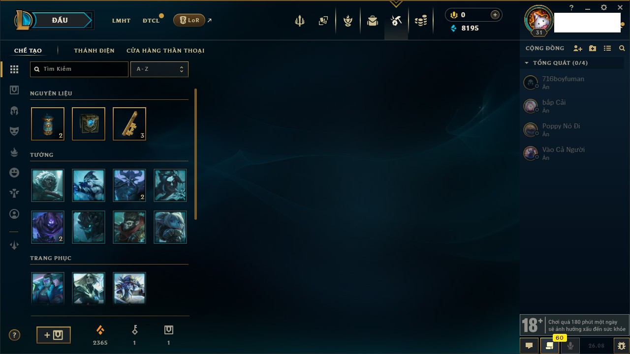 Rank Đơn: Chưa rank mùa nàoKhung: Chưa có khungTướng: 20 - Còn 4410 THXTrang Phục: 2Rank ĐTCL: Chưa RankLinh Thú: 2