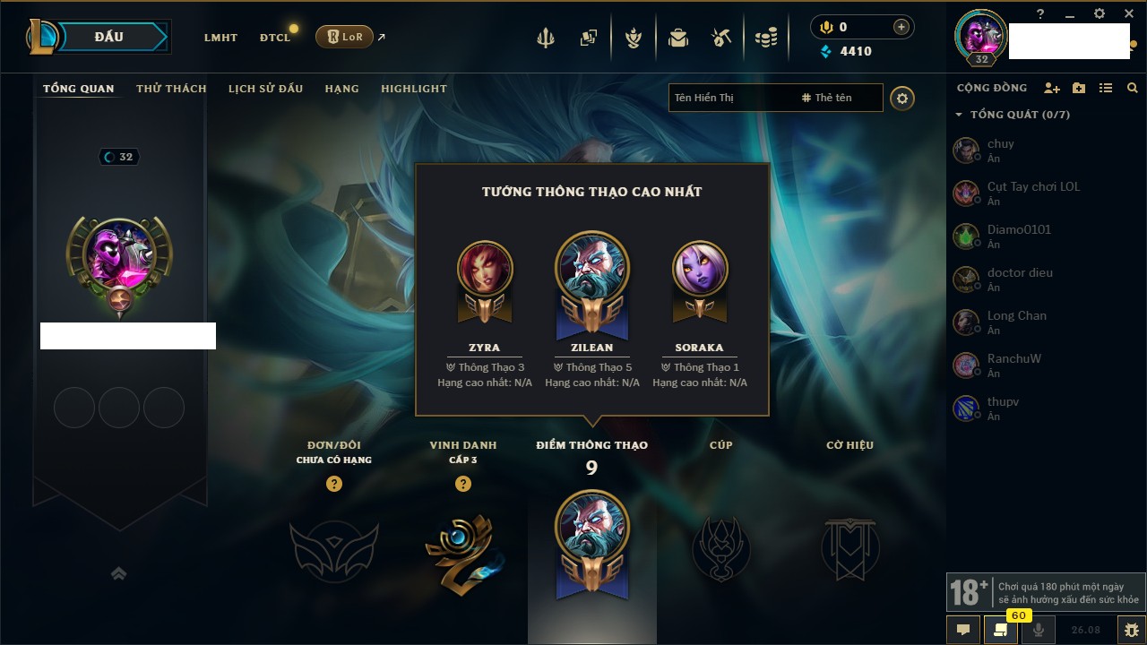 Rank Đơn: Chưa rank mùa nàoKhung: Chưa có khungTướng: 19 - Còn 410 THXTrang Phục: 0Rank ĐTCL: Chưa RankLinh Thú: 6