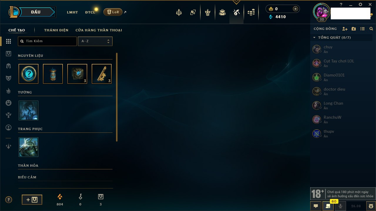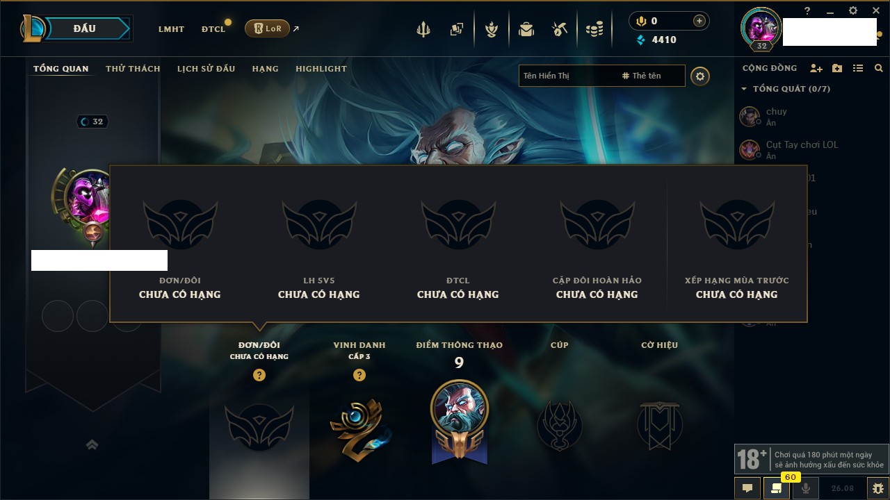 Rank Đơn: Chưa rank mùa nàoKhung: Chưa có khungTướng: 20 - Còn 4410 THXTrang Phục: 2Rank ĐTCL: Chưa RankLinh Thú: 2