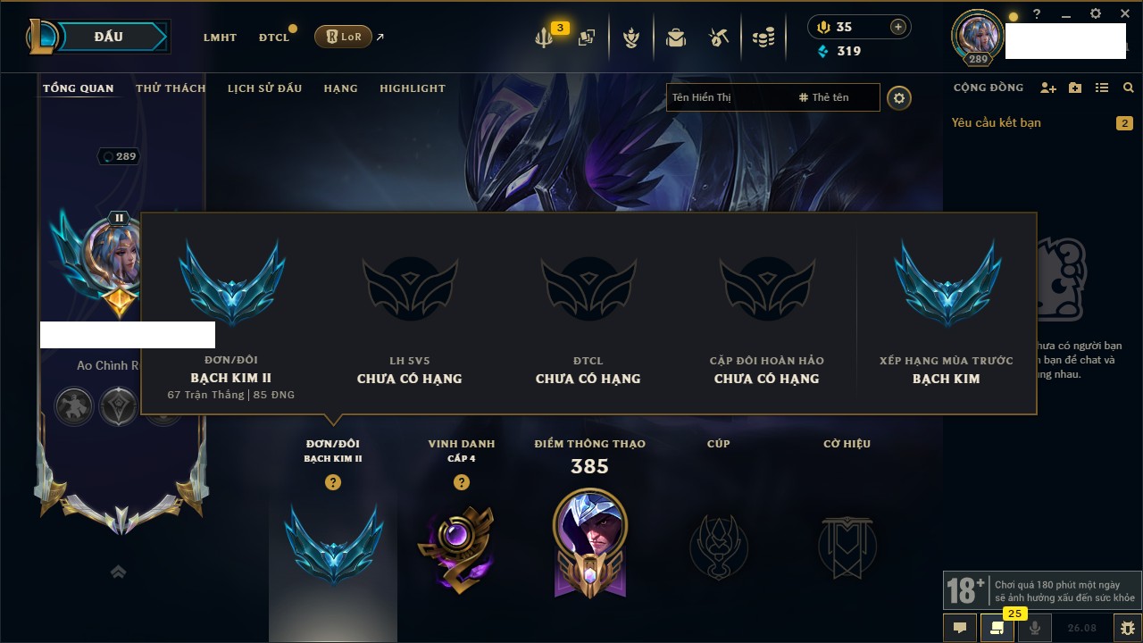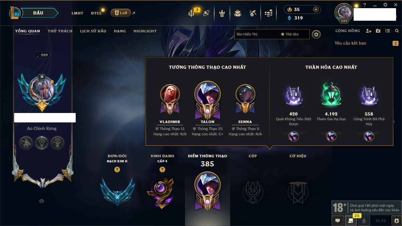 Rank Đơn: Bạch Kim IIKhung: Bạch kimTướng: 167 - Còn 319 THXTrang Phục: 352Rank ĐTCL: Chưa RankLinh Thú: 14