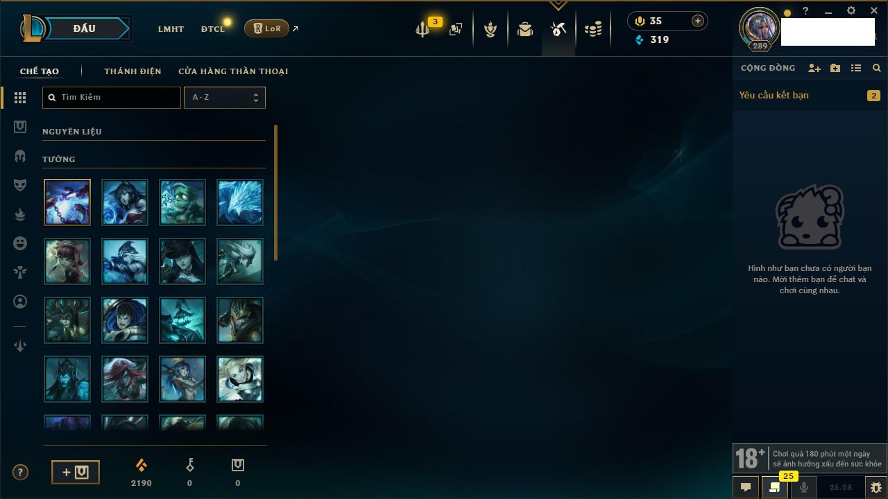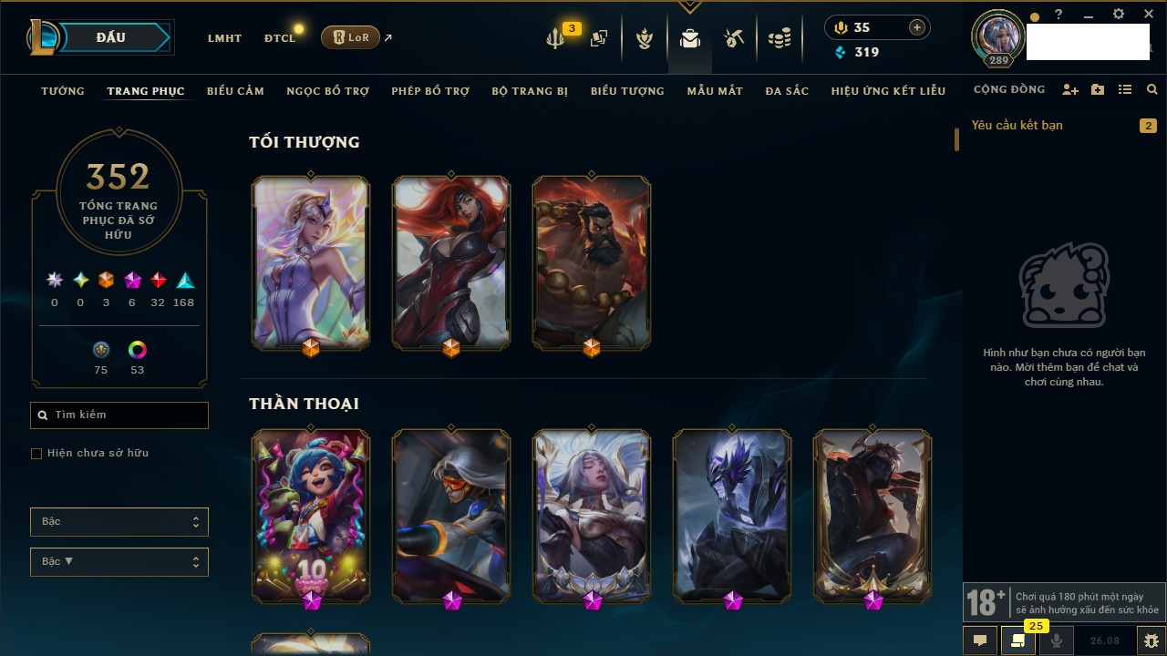 Rank Đơn: Chưa RankKhung: Chưa có khungTướng: 172 - Còn 44783 THXTrang Phục: 105Rank ĐTCL: Chưa RankLinh Thú: 212