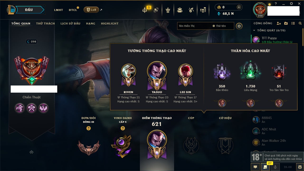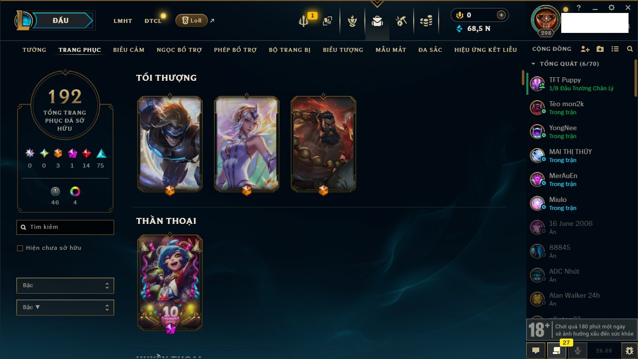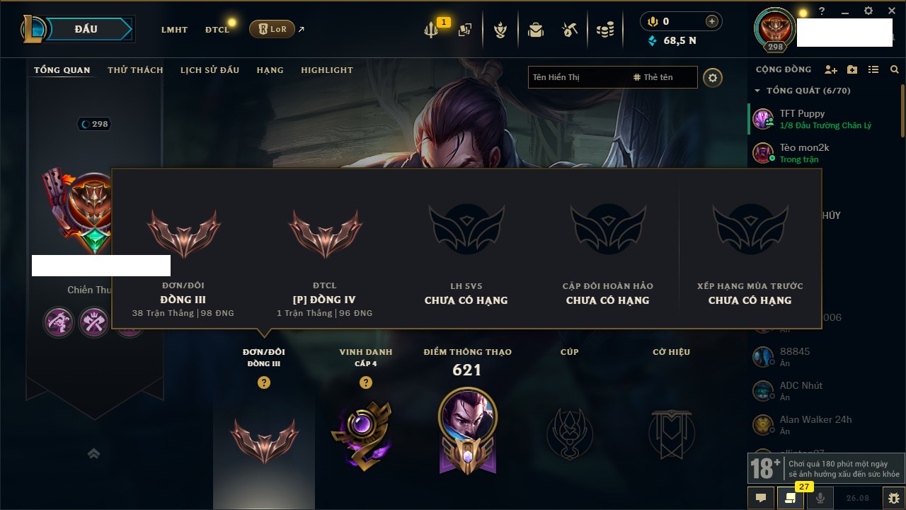 Rank Đơn: Đồng III Khung: Chưa có khung Tướng: 166 - Còn 68567 THX Trang Phục: 192 Rank ĐTCL: Đồng IV Linh Thú: 57