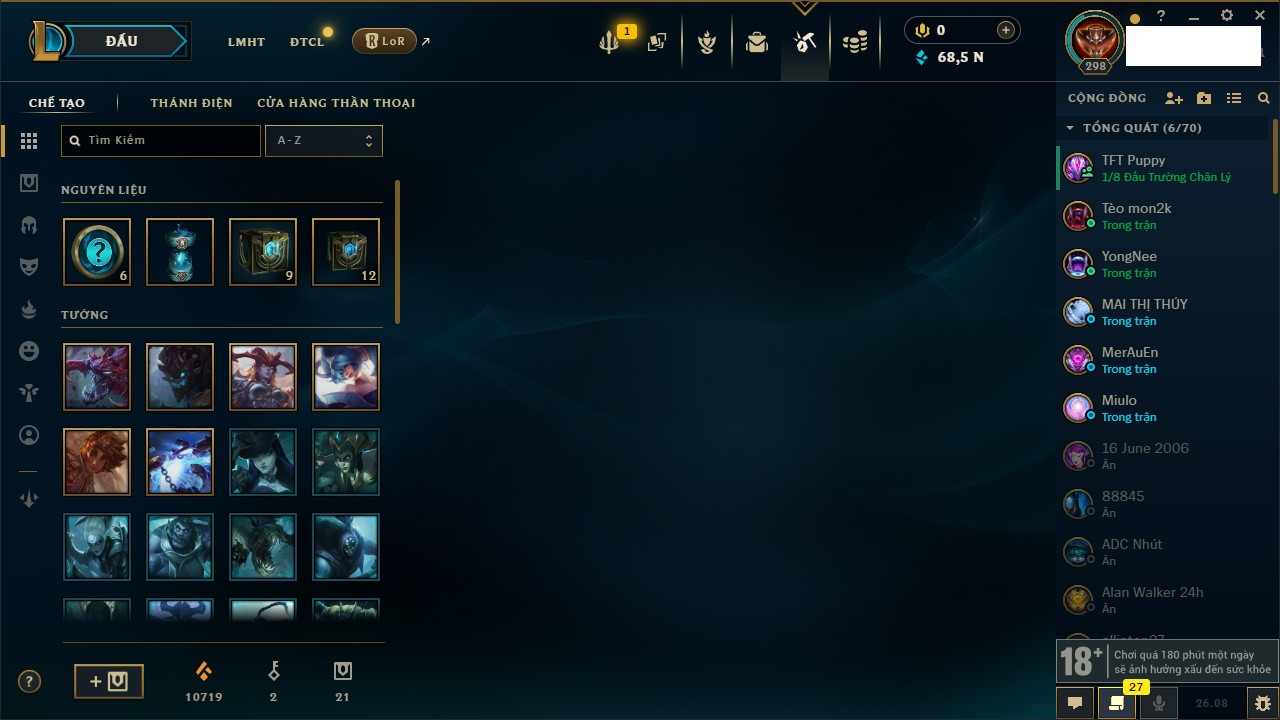 Rank Đơn: Chưa rank mùa nào Khung: Chưa có khung Tướng: 7 - Còn 15300 THX Trang Phục: 0 Rank ĐTCL: Bạc III Linh Thú: 18