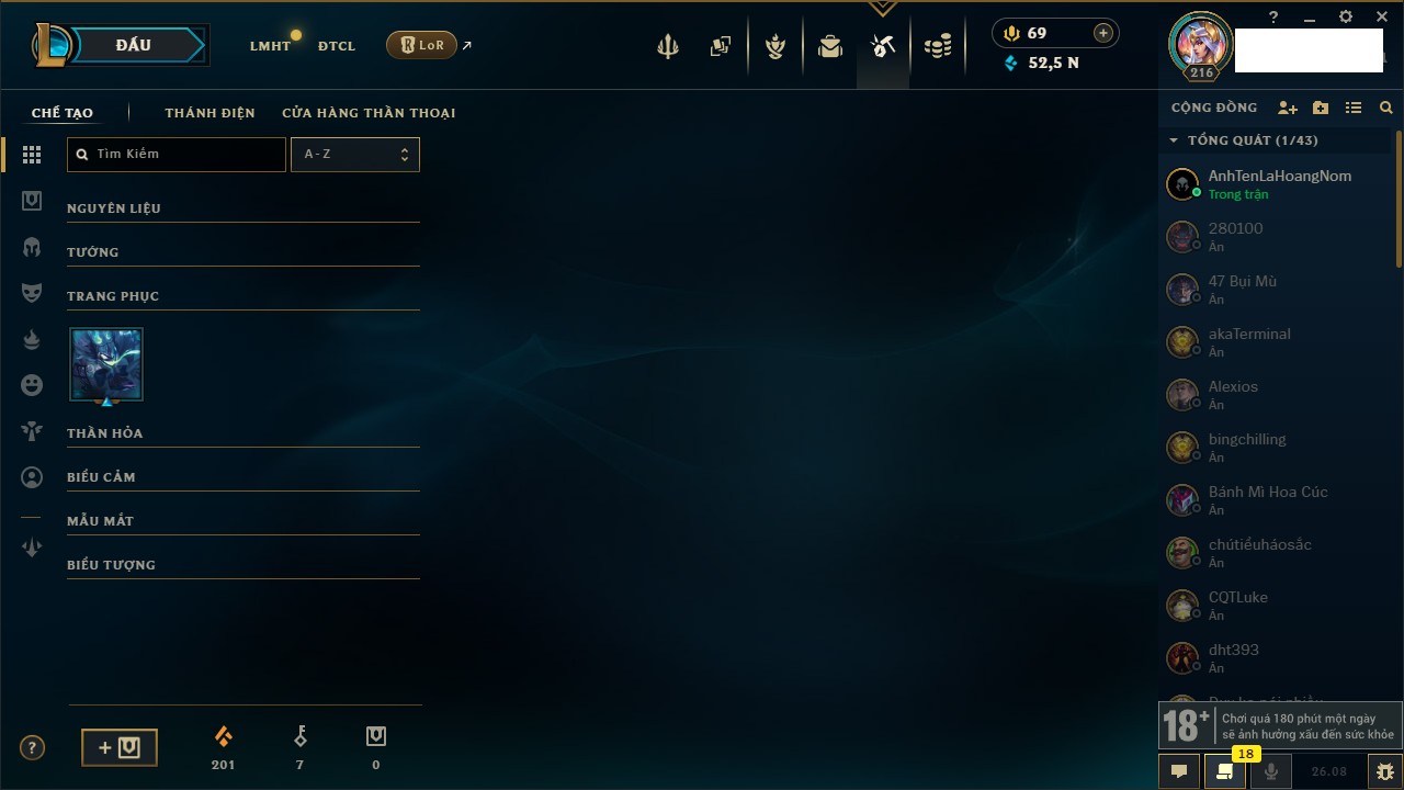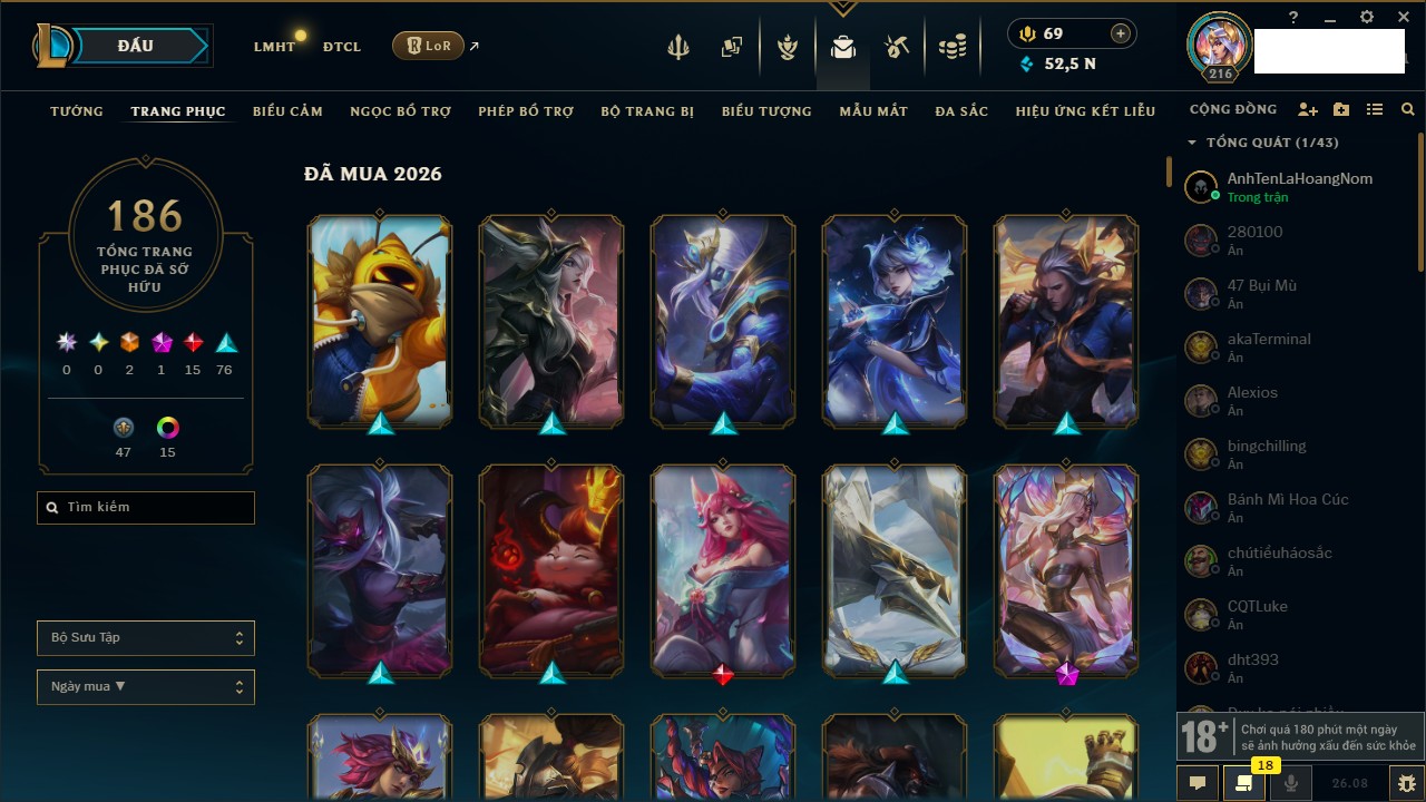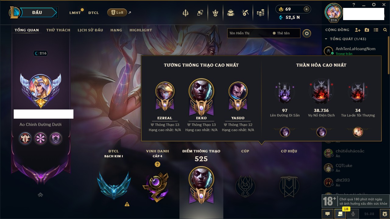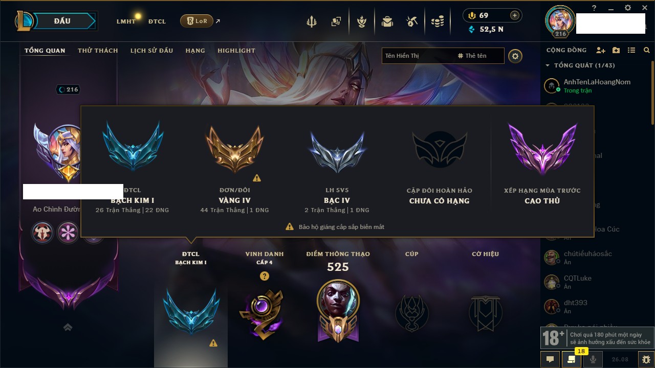 Rank Đơn: Vàng IV Khung: Bạc Tướng: 172 - Còn 52546 THX Trang Phục: 186 Rank ĐTCL: Bạch Kim I Linh Thú: 116