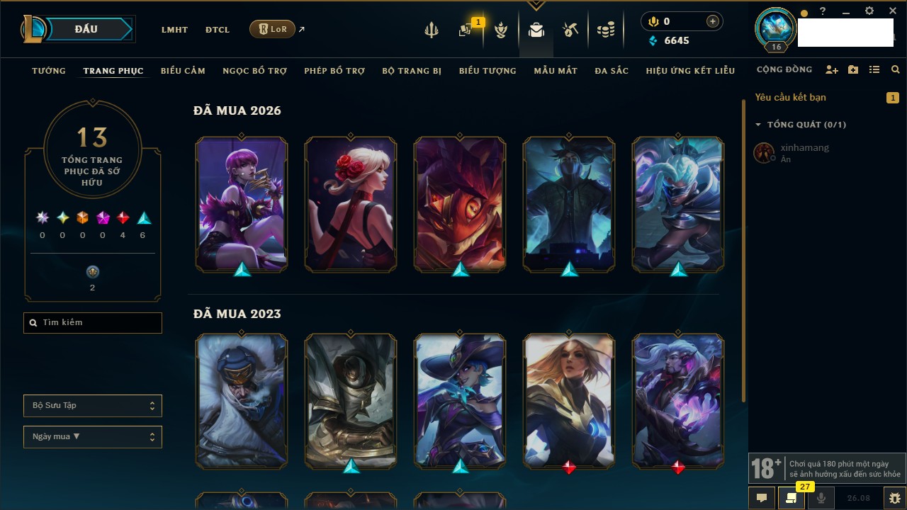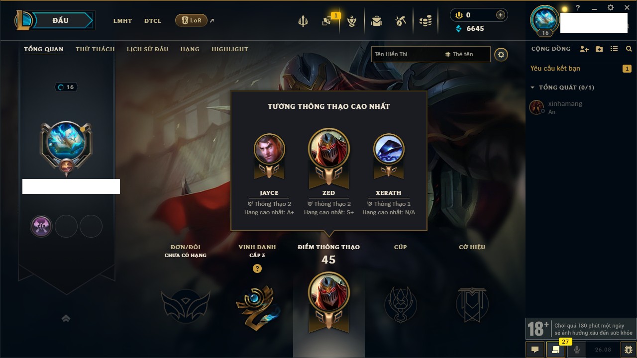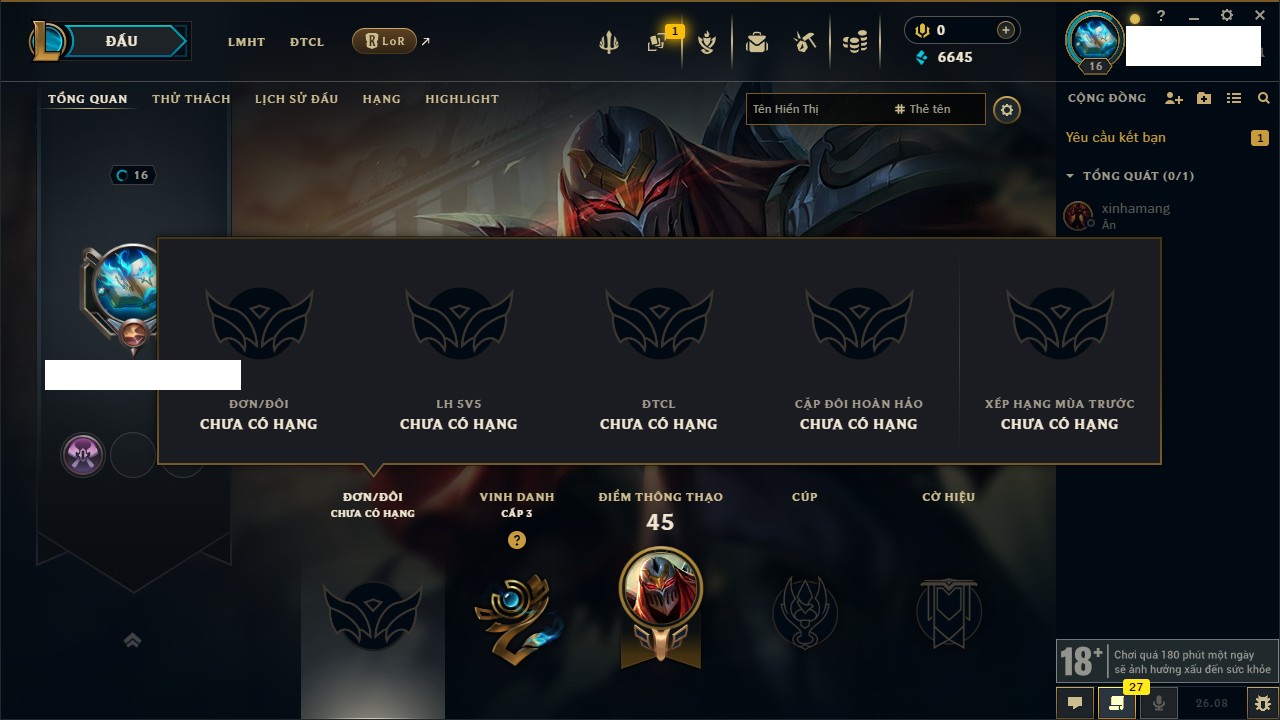 Rank Đơn: Chưa rank mùa nàoKhung: Chưa có khungTướng: 172 - Còn 6645 THXTrang Phục: 13Rank ĐTCL: Chưa RankLinh Thú: 22